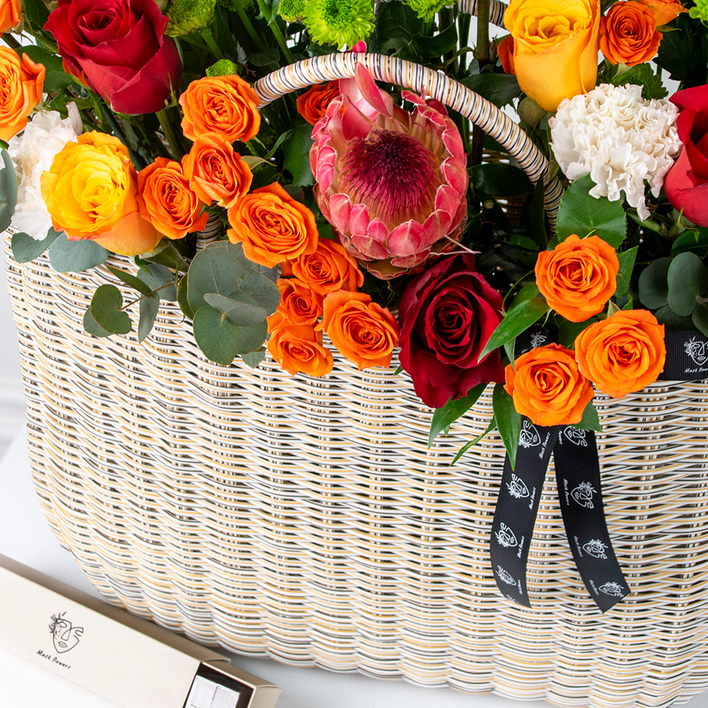 سلة مليئة بأزهار الجوري، بيبي روز، الكارنيشن والبروتيا مع تغريسة والشوكولاتة.
