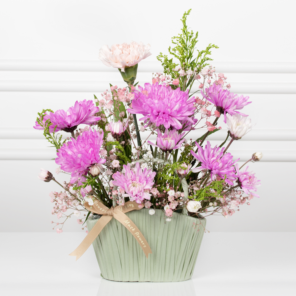 سلة مع زهور الكارنيشن، الكريز والجبسوفيلا مرتبة بشكل جميل.