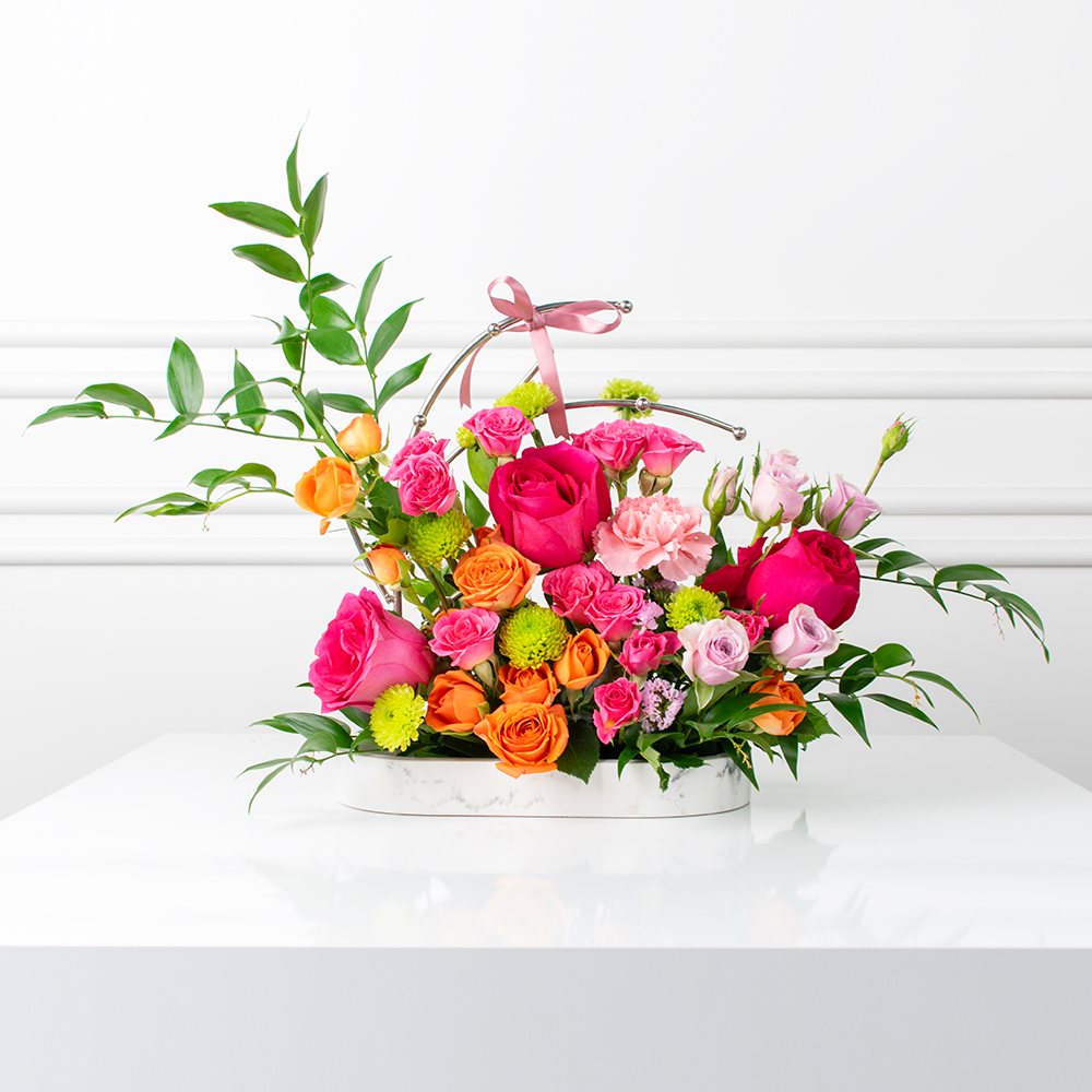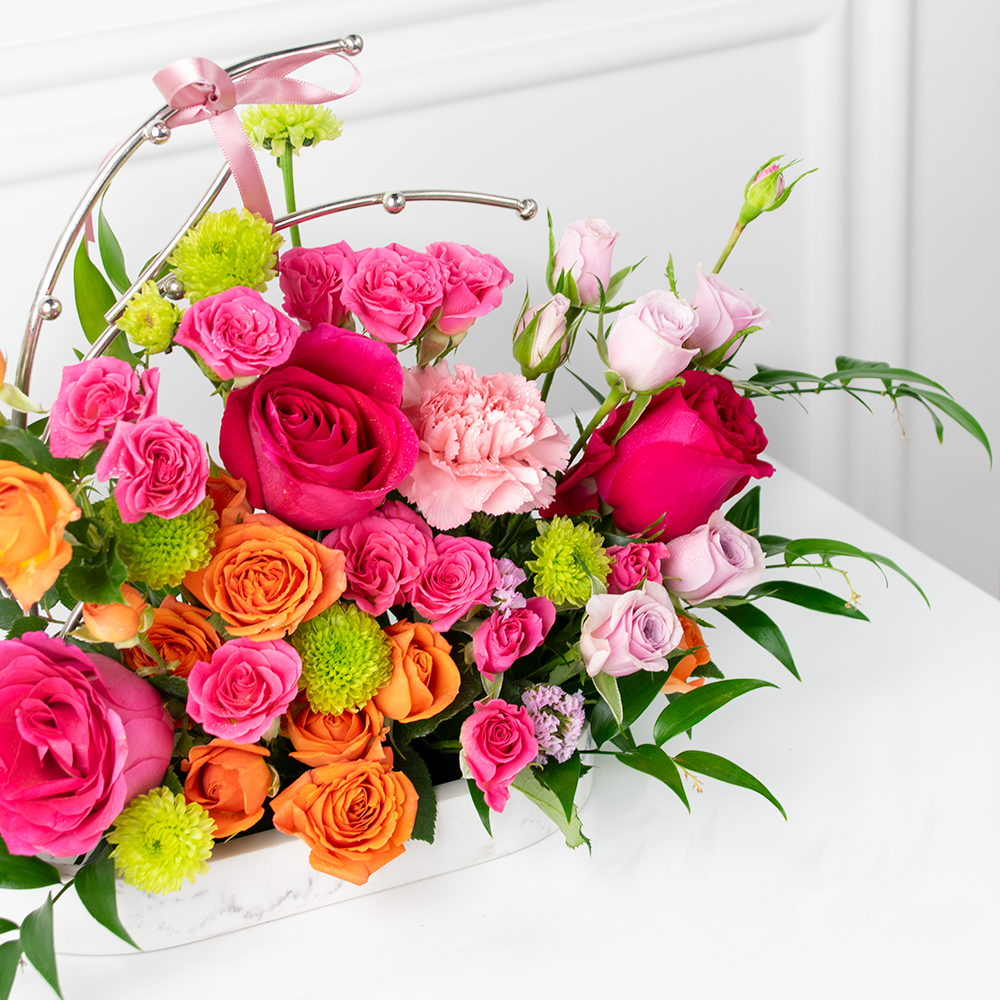 قاعدة باللون الأبيض مع الأزهار بألوان جميلة من الجوري، الكارنيشن والبيبي روز.