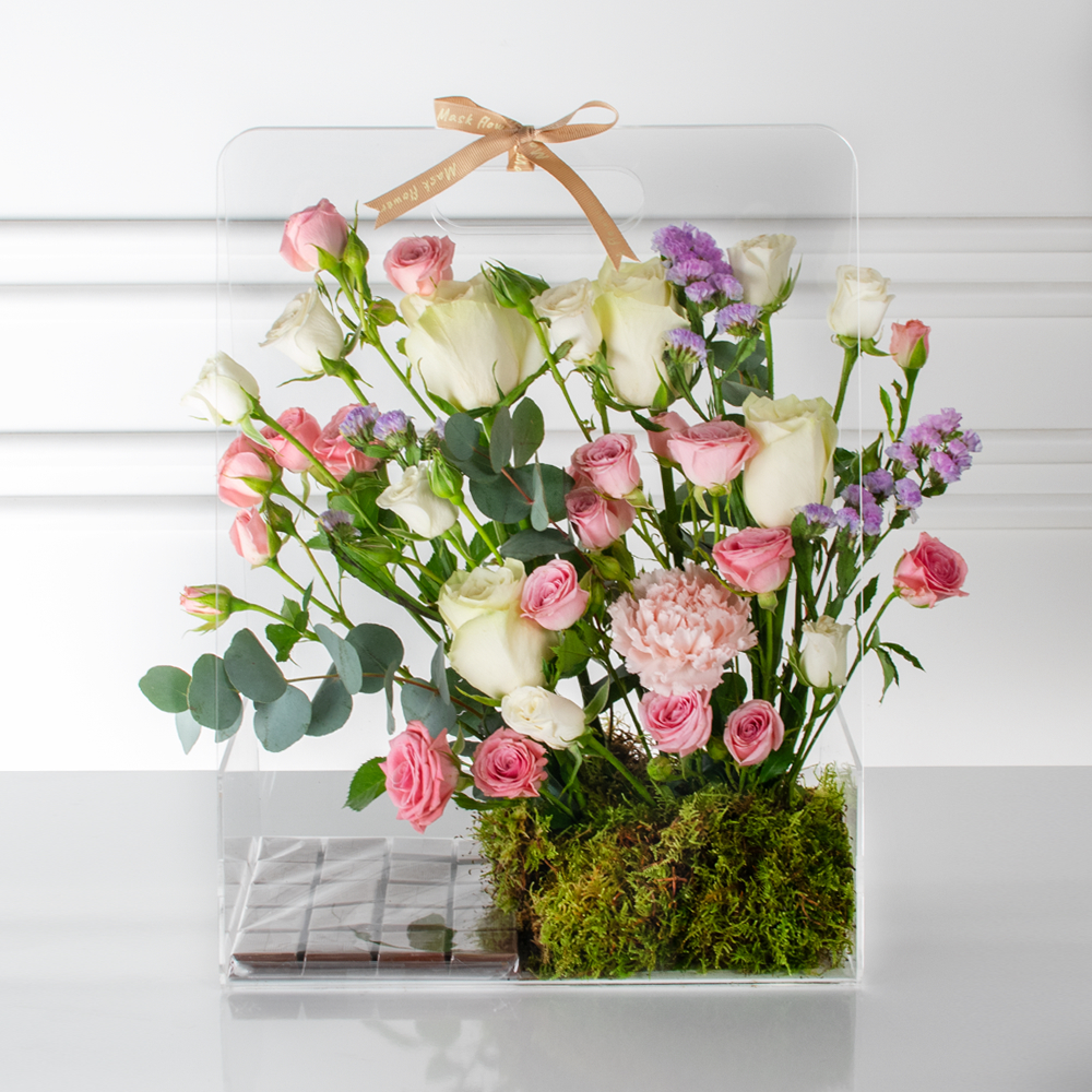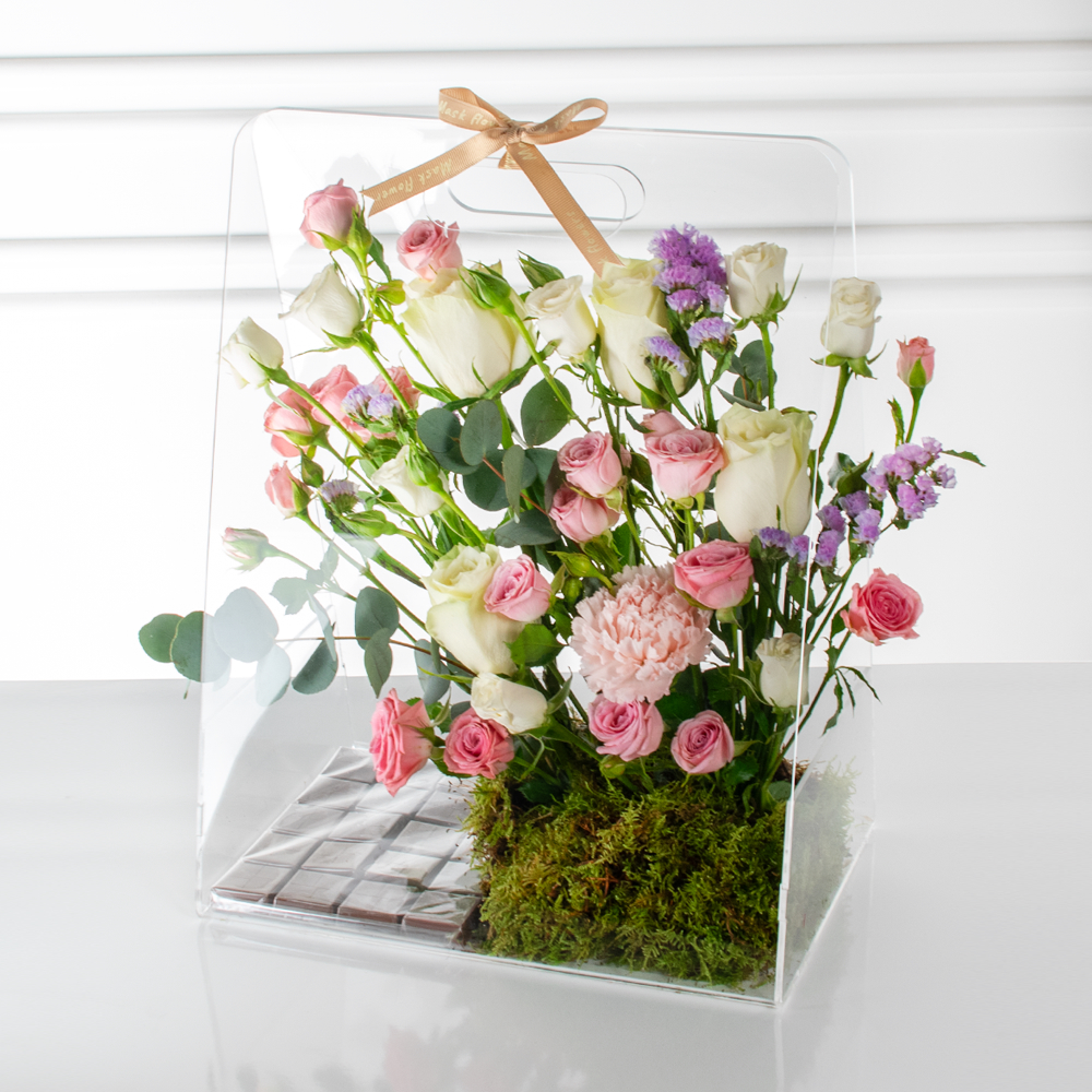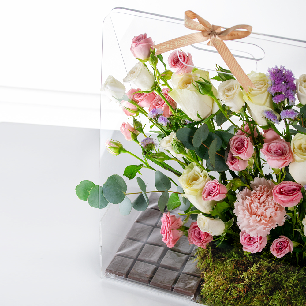 شنطة اكريلك شفاف مع زهور البيبي جوري والجوري مع 20 قطعه شوكولاتة ومقاس اجمالي 40 سم في 30 سم.