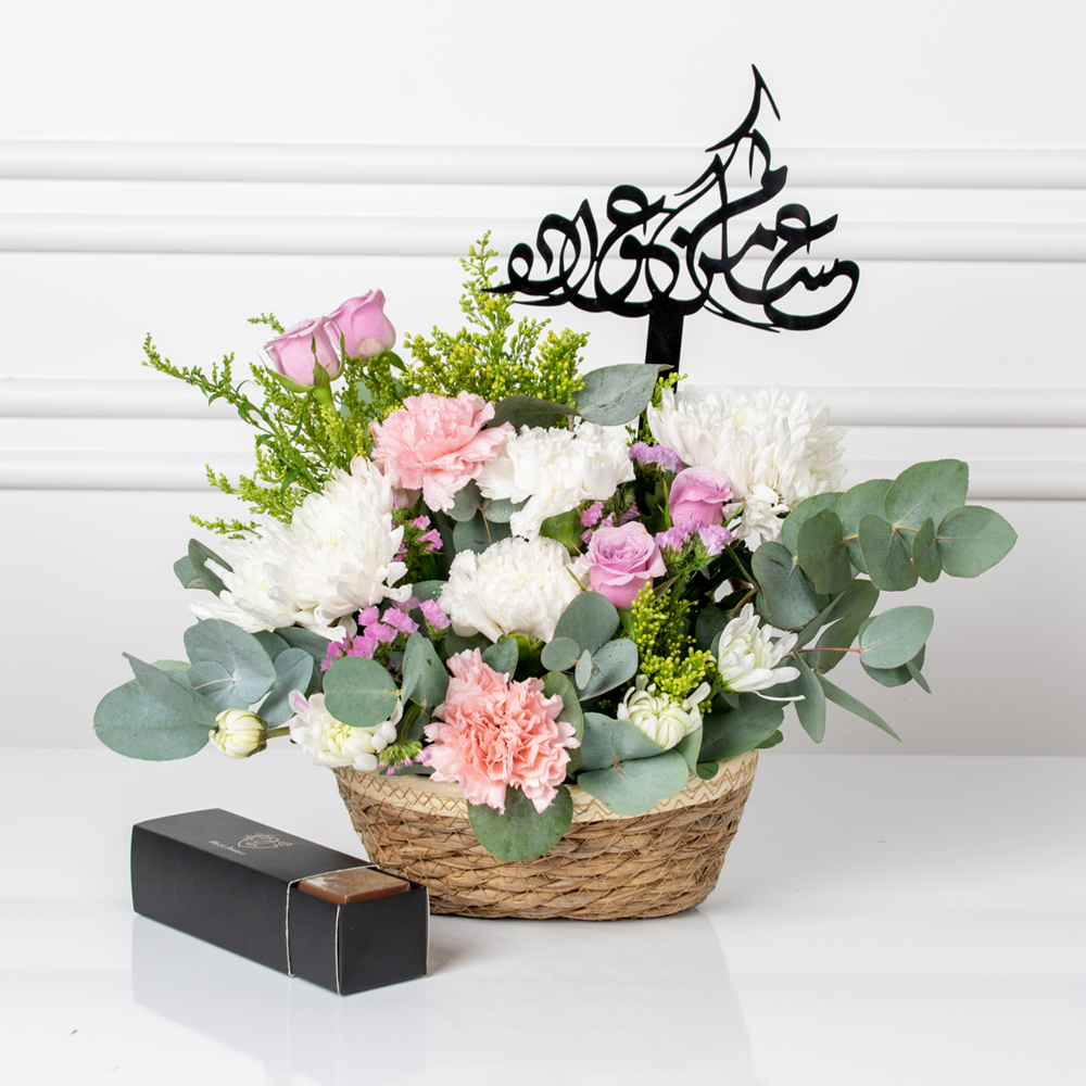 سلة من القش صغيرة مرتبة بشكل جميل مع زهور الكارنيشن والبيبي روز والستاتوس مع السيداغو مع علبة شوكولاتة صفيرة وتوبر رمضان.
