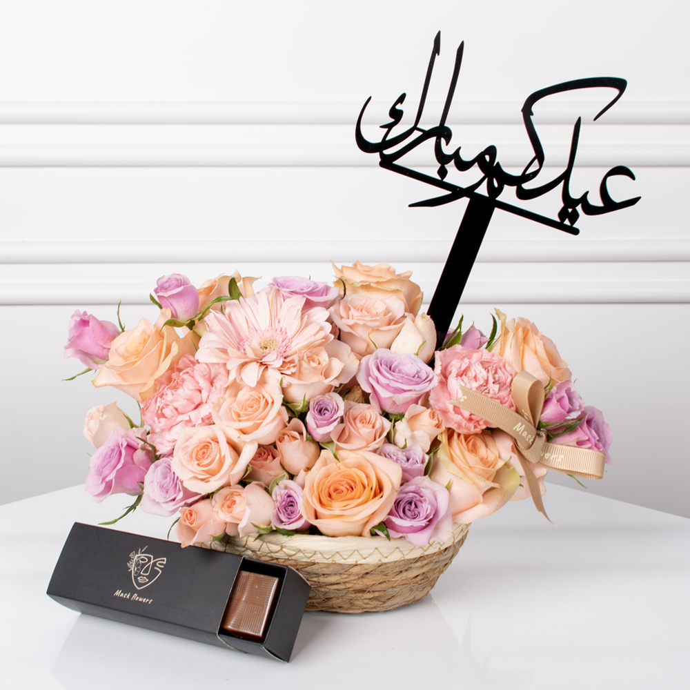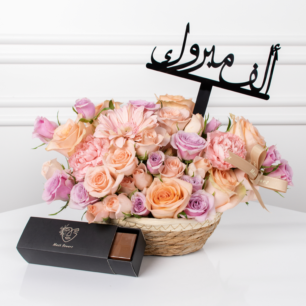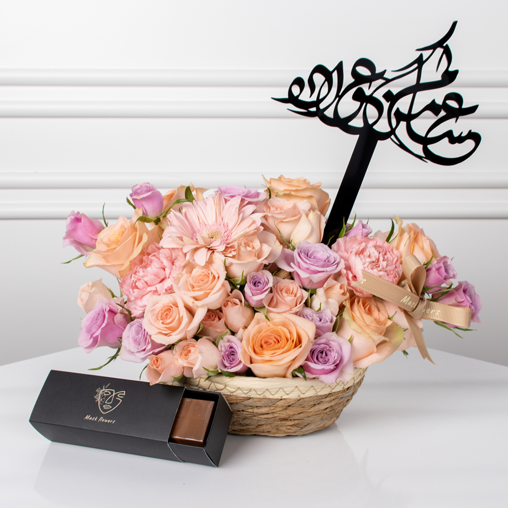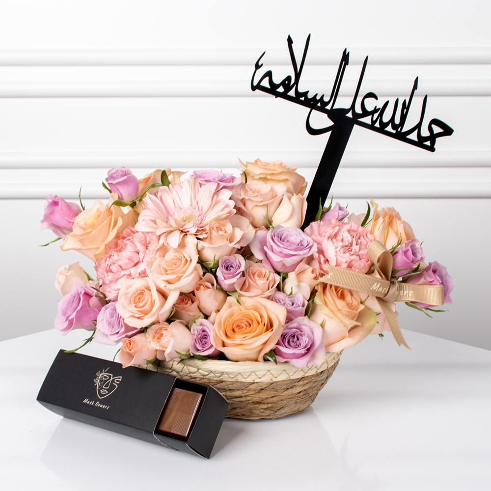 سلة من القش تتميز بزهور الجوري، الجيربيرا، الكارنيشن والبيبي جوري بتصميم جميل. تأتي مع علبة شوكولاتة وتغريسة من الأكريليك.