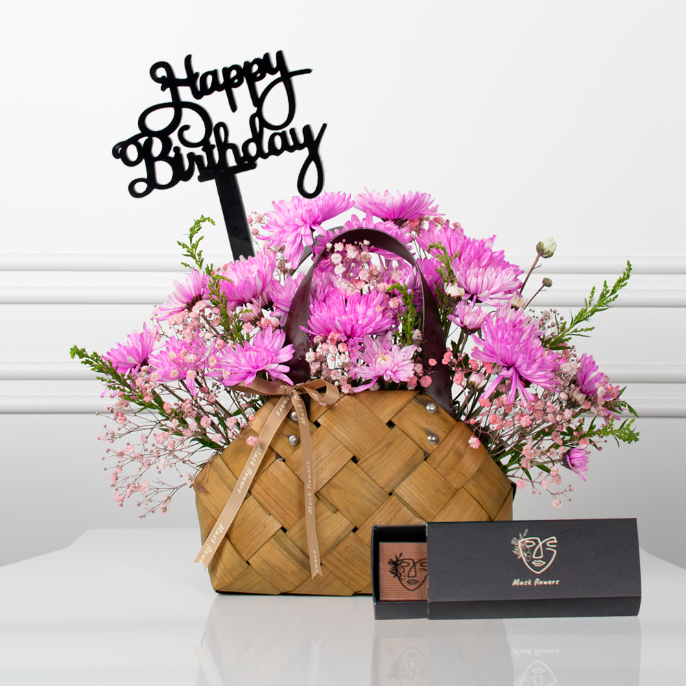 زهور الكارنيشن مرتبة بشكل جميل في سلة مع بطاقة مع علبة شوكولاتة وتوبر اكريلك.