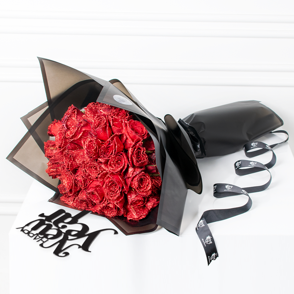 باقة من جوري مع لماع احمر وغلاف اسود مع توبر أكريليك.