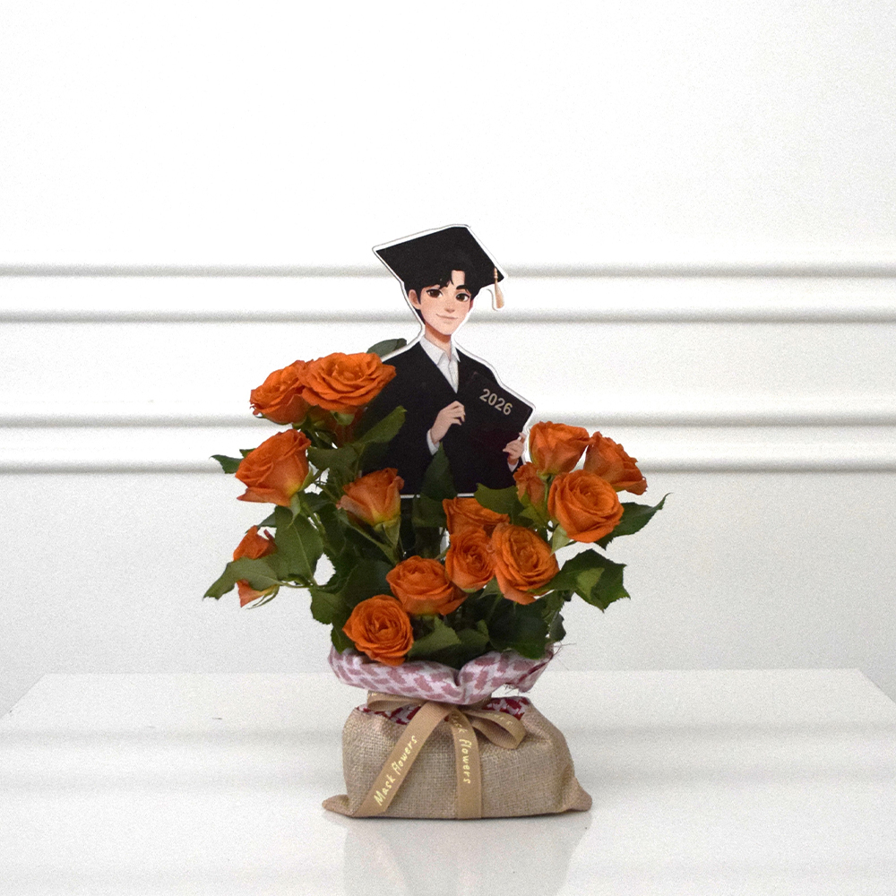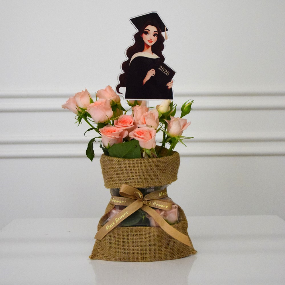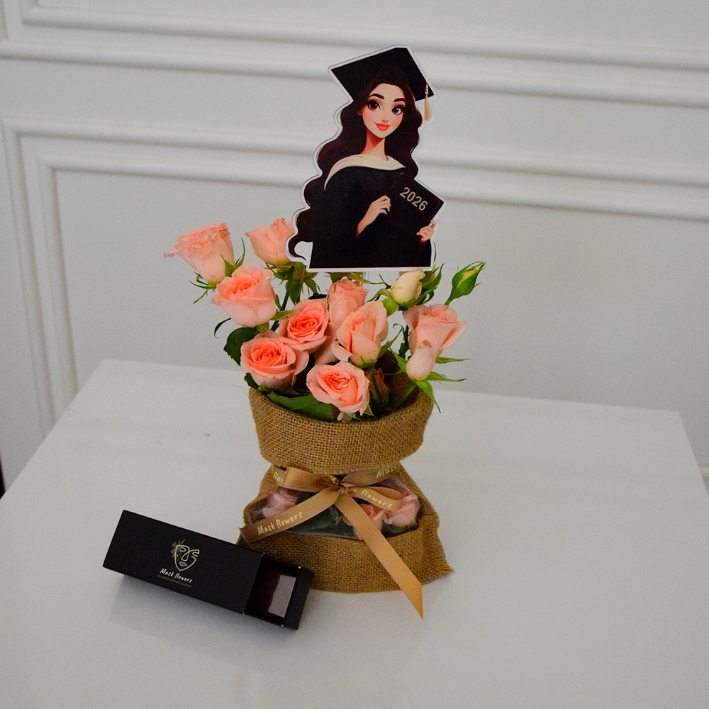 صينية خشبية طبيعية مرتبة بزهور البيبي جوري، الكارنيشن وزهور الواكس الهولندية، تأتي مع الشوكولاتة.