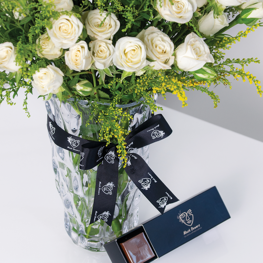فازة كريستال تحتوي على 20 من أزهار البيبي روز البيضاء مع الشوكولاتة.