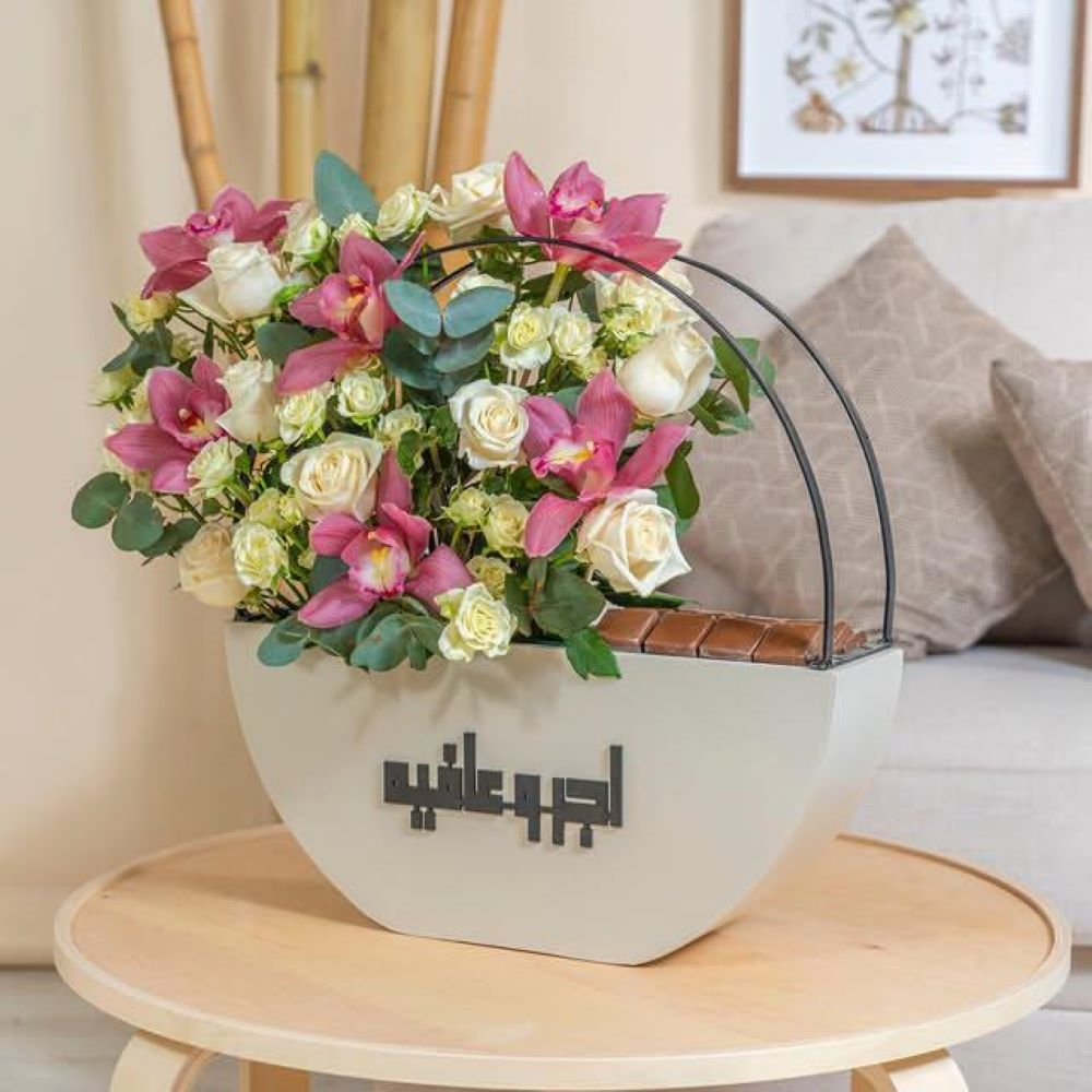 باقة تحتوي على زهور الجوري، البيبي جوري والأوركيد مرتبة بشكل جميل في ستاند مع الشوكولاتة.