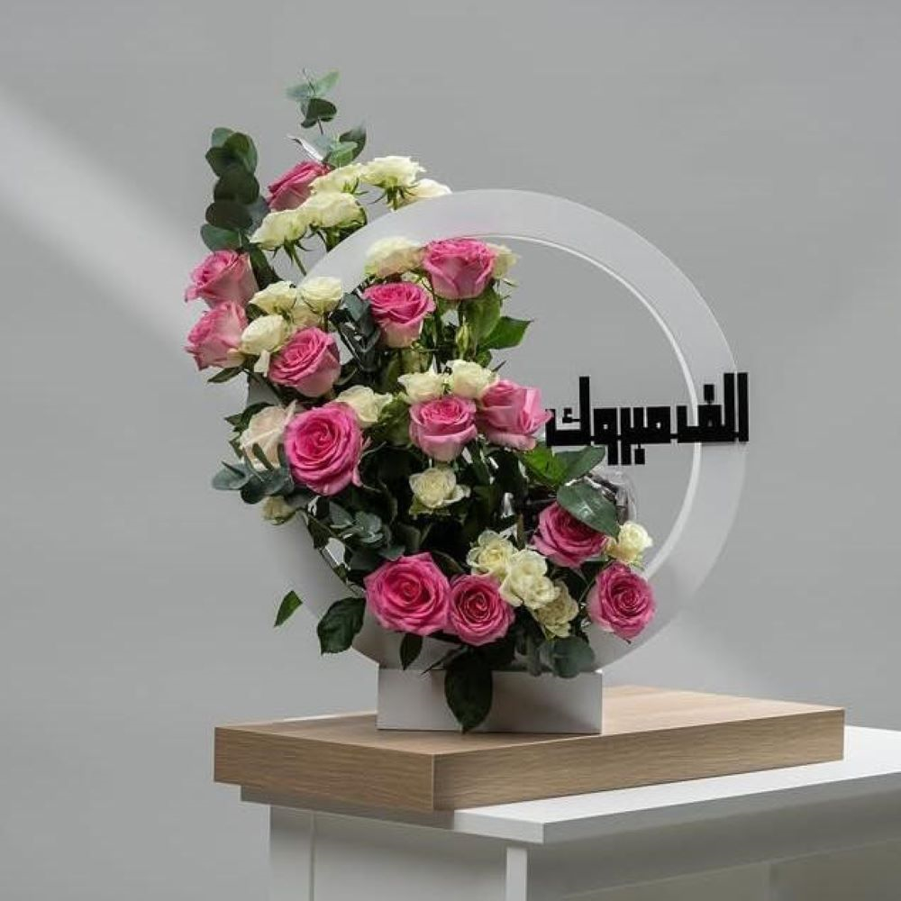 ستاند خشبي يحتوي على الجوري والبيبي جوري مع الشوكولاتة مزينة بتصميم جميل.