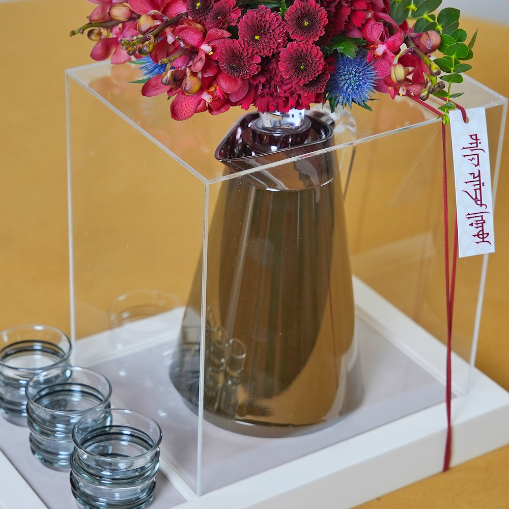 صينية باللون البيج تضم مجموعة قهوة أنيقة، بتصميم فاخر من أزهار الأوركيد وأزهار كريزانتم، مع بطاقة رمضانية، لمسة احتفالية مثالية للشهر الفضيل.