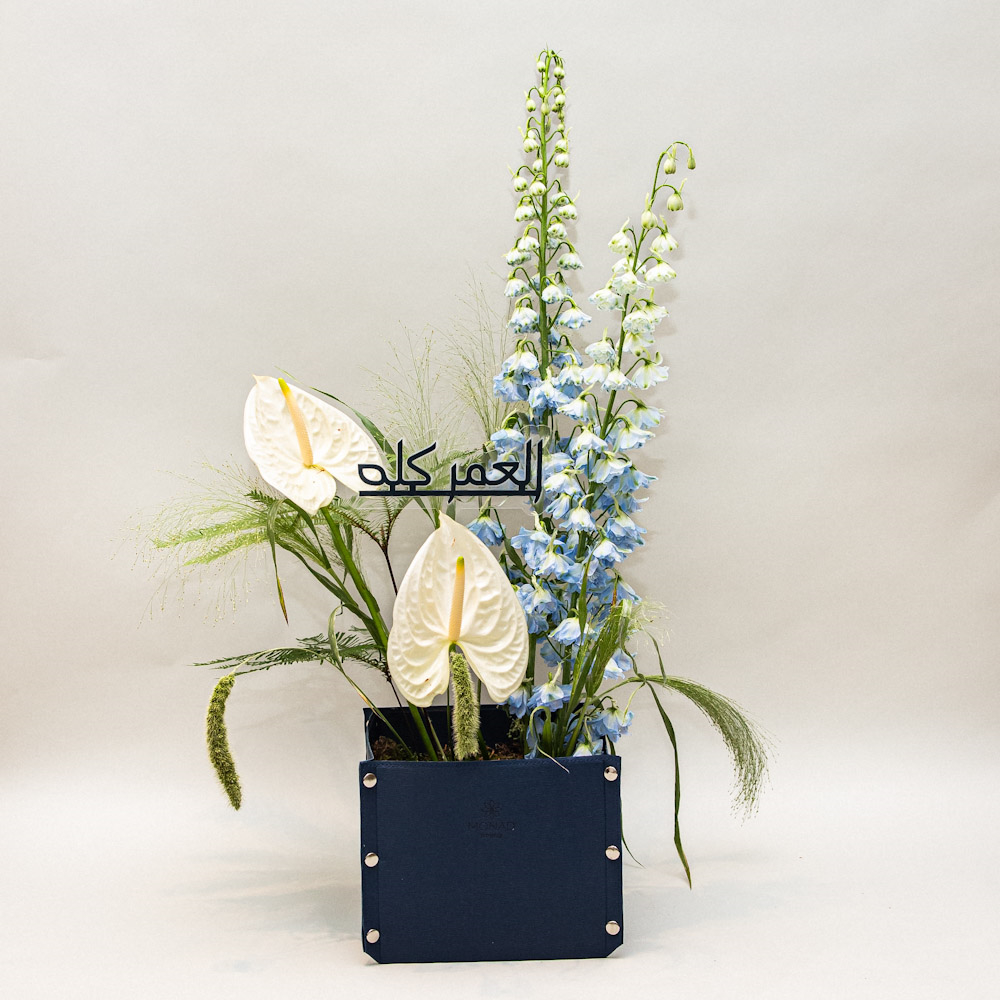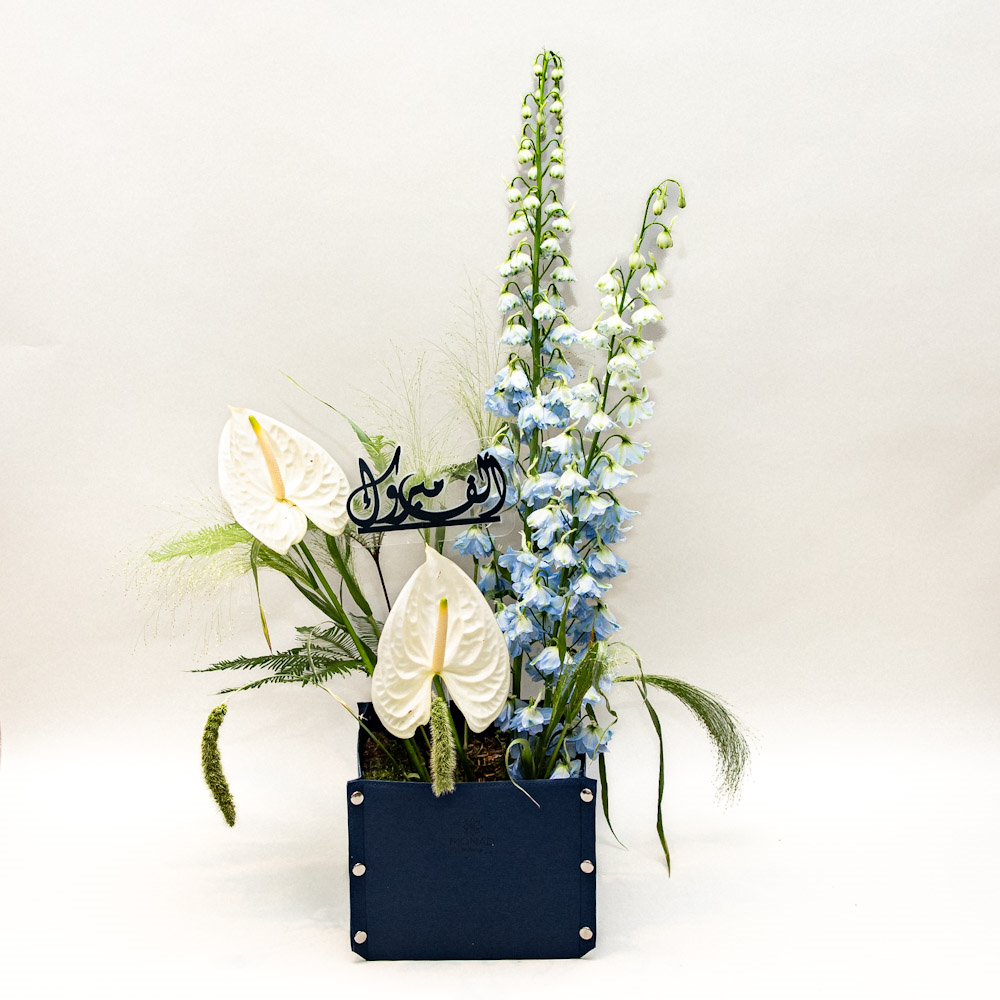 مقدم في قاعدة جلدية فاخرة وعصرية، يضم هذا التنسيق المميز زهور الأنثوريوم البيضاء الأنيقة مع سيقان الدلفينيوم الزرقاء الطويلة ولمسات خضراء انسيابية. قطعة فنية راقية تناسب الإهداء الفاخر أو لإضافة حضور أنيق ومميز لأي مكان.