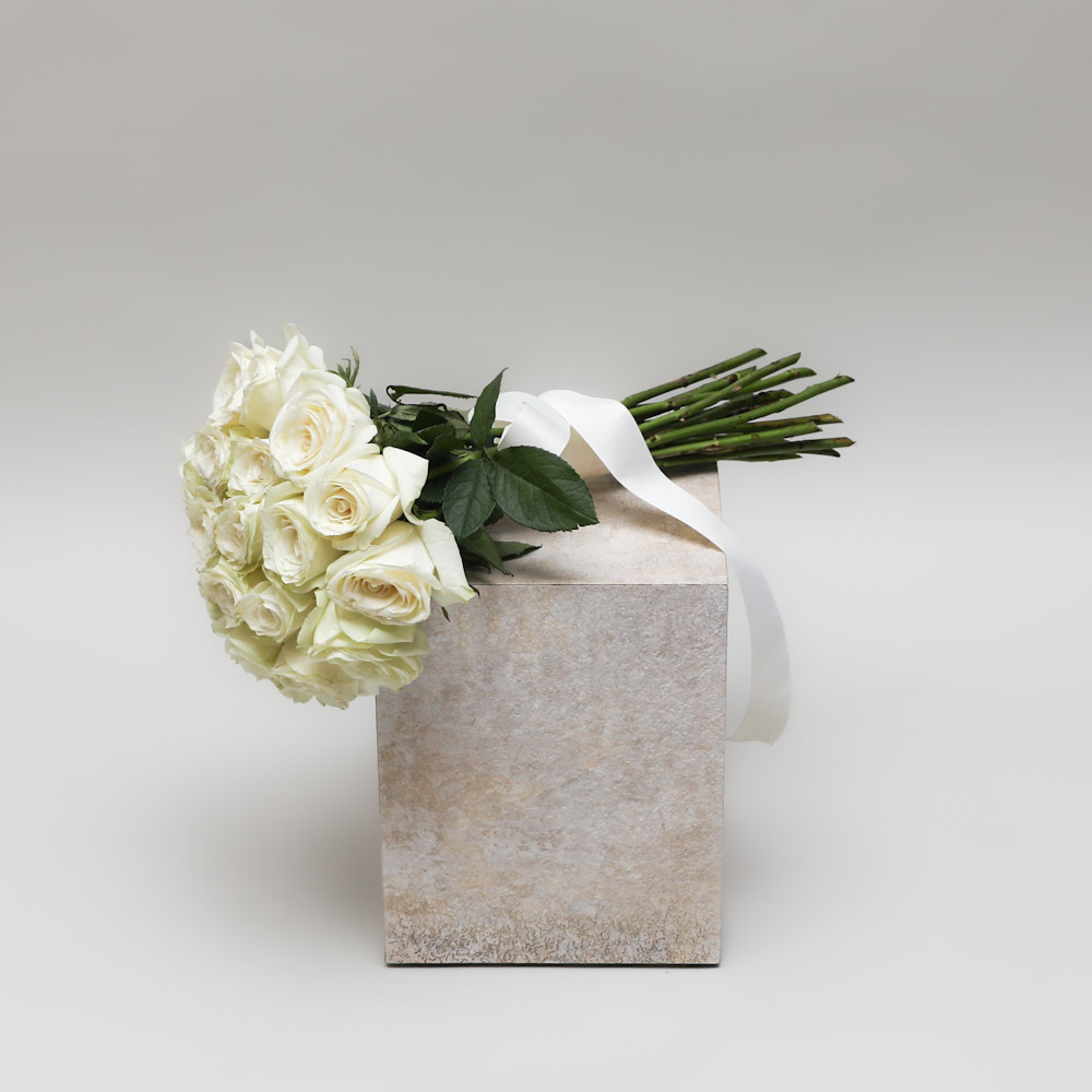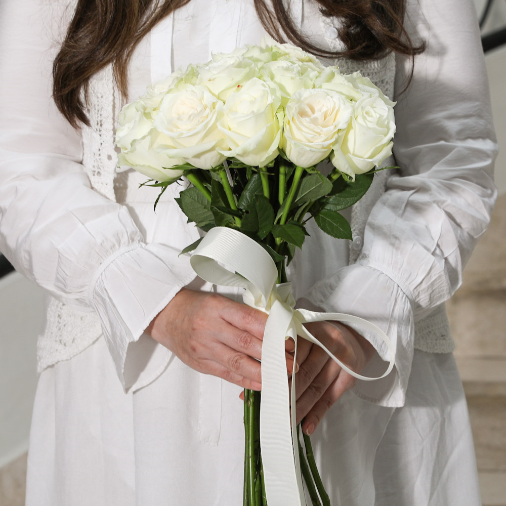 باقة العروس الأنيقة تتميز بأزهار الجوري البيضاء الناعمة بتصميم كلاسيكي مع شريط ناعم. تعكس جمالاً خالداً وأناقة ناعمة تليق بإطلالة العروس.
