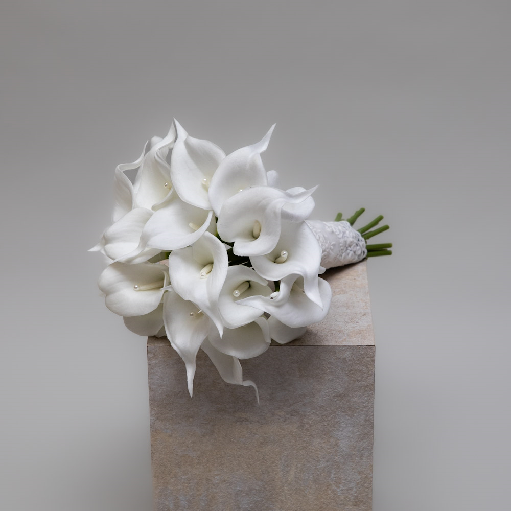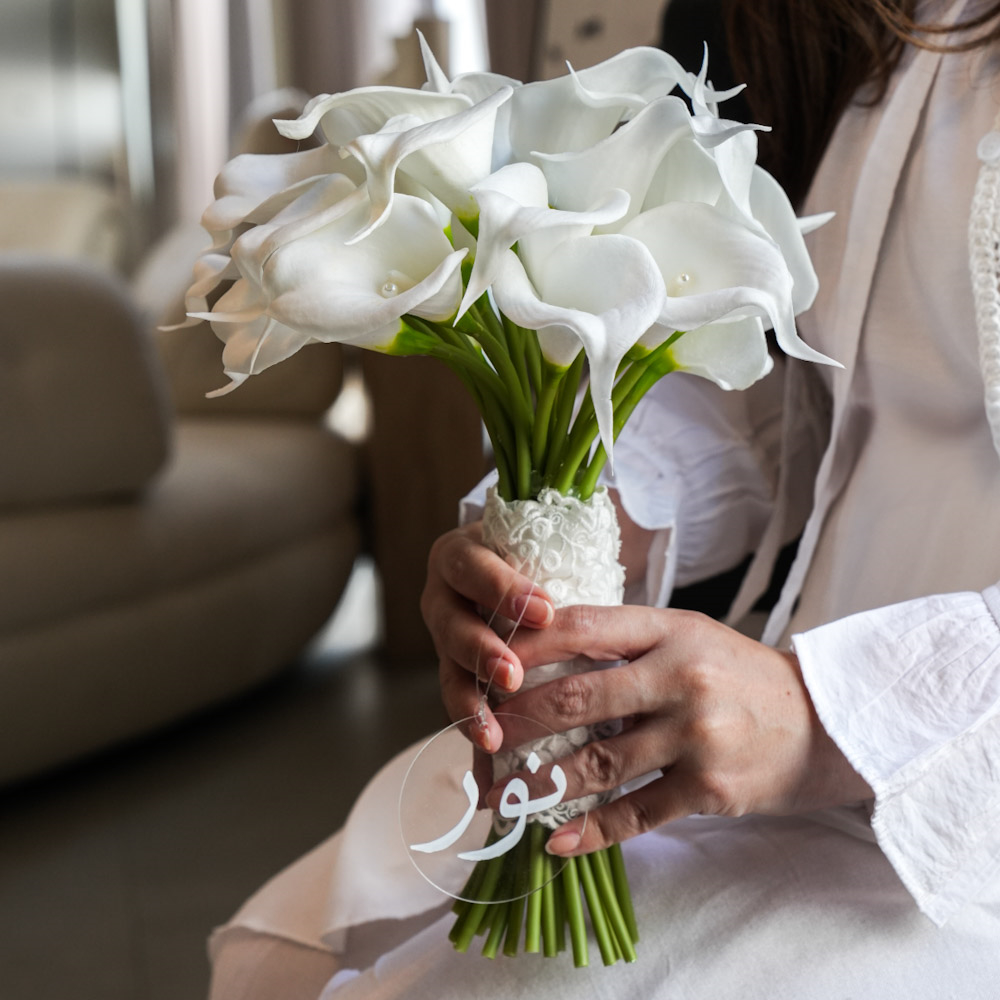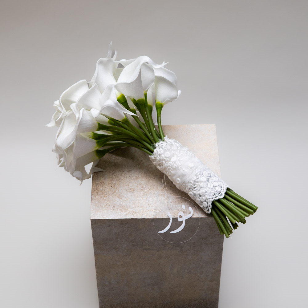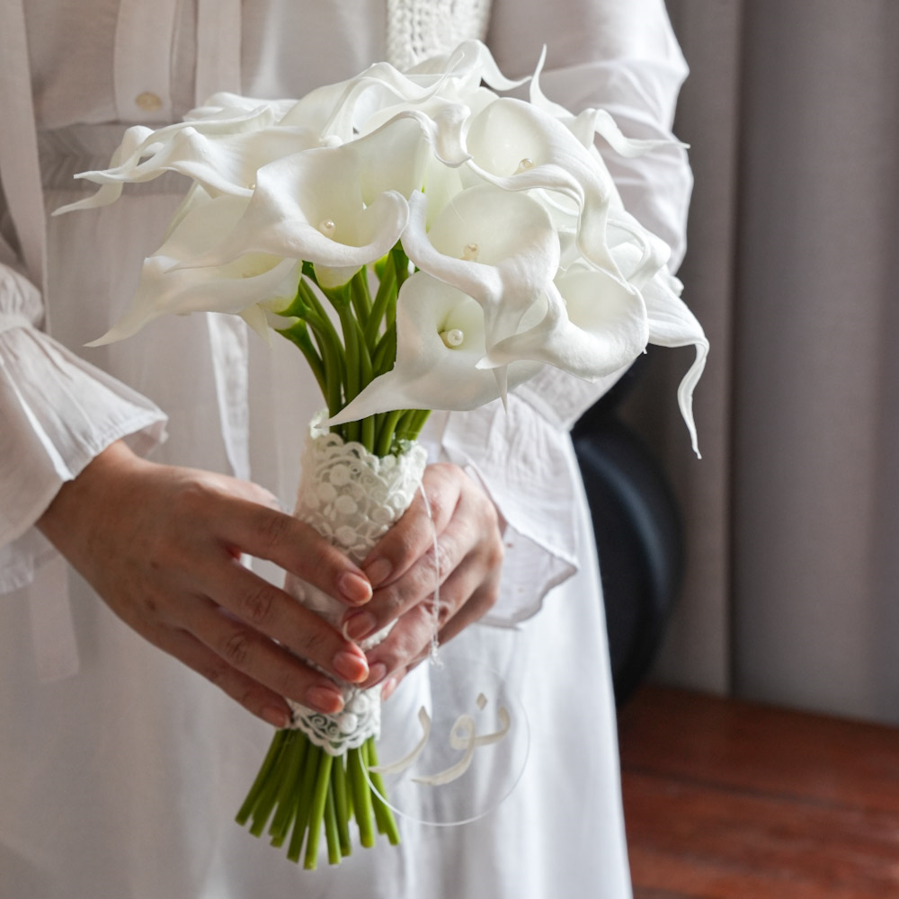 باقة العروس الفاخرة تتميز بأزهار الكالا ليلي البيضاء بتصميم ناعم وأنيق. تعكس النقاء والبساطة بأسلوب فاخر.