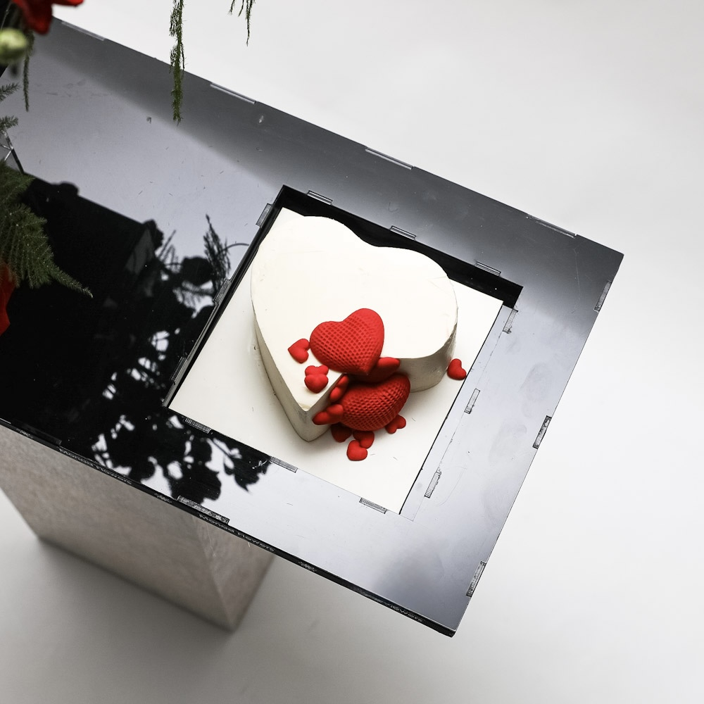 مجموعة حب راقية تجمع بين تنسيق غني من زهور الجوري الحمراء وكيك على شكل قلب، مقدمة على صينية عصرية أنيقة. قطعة متكاملة تعبر عن الحب بأسلوب دافئ ومميز.