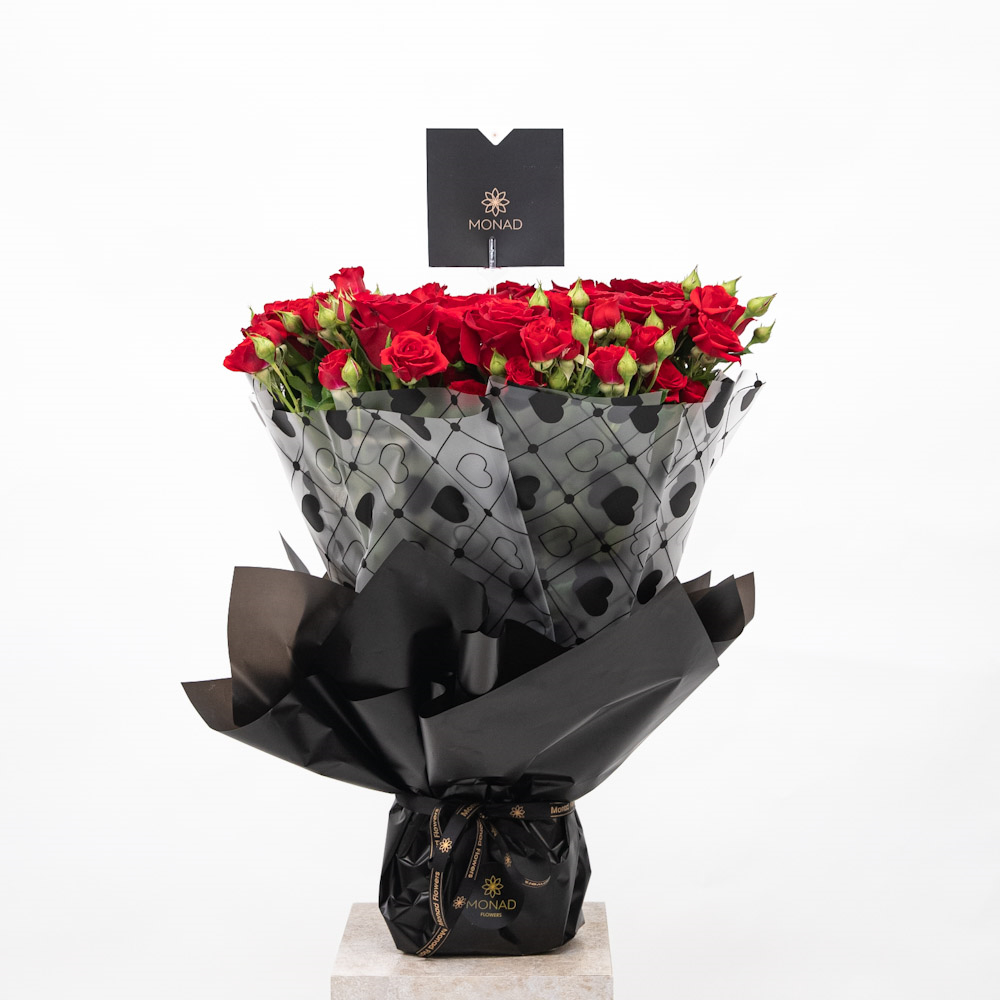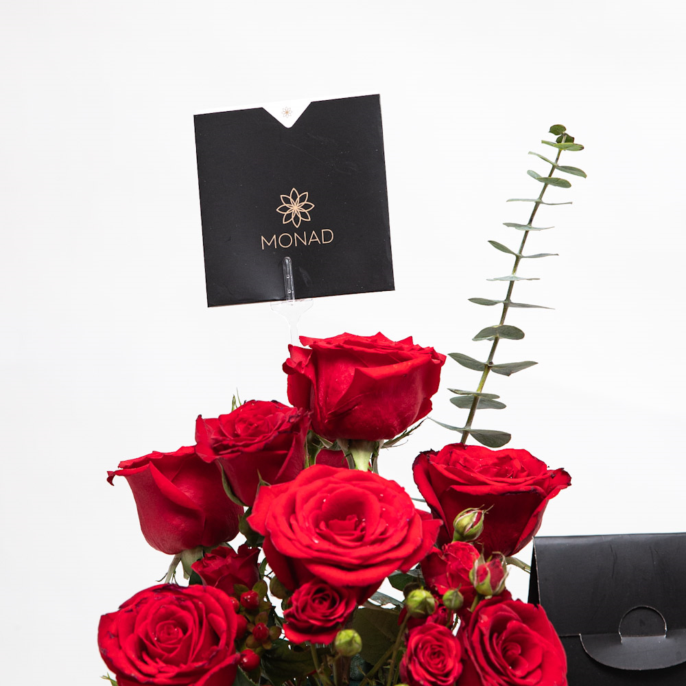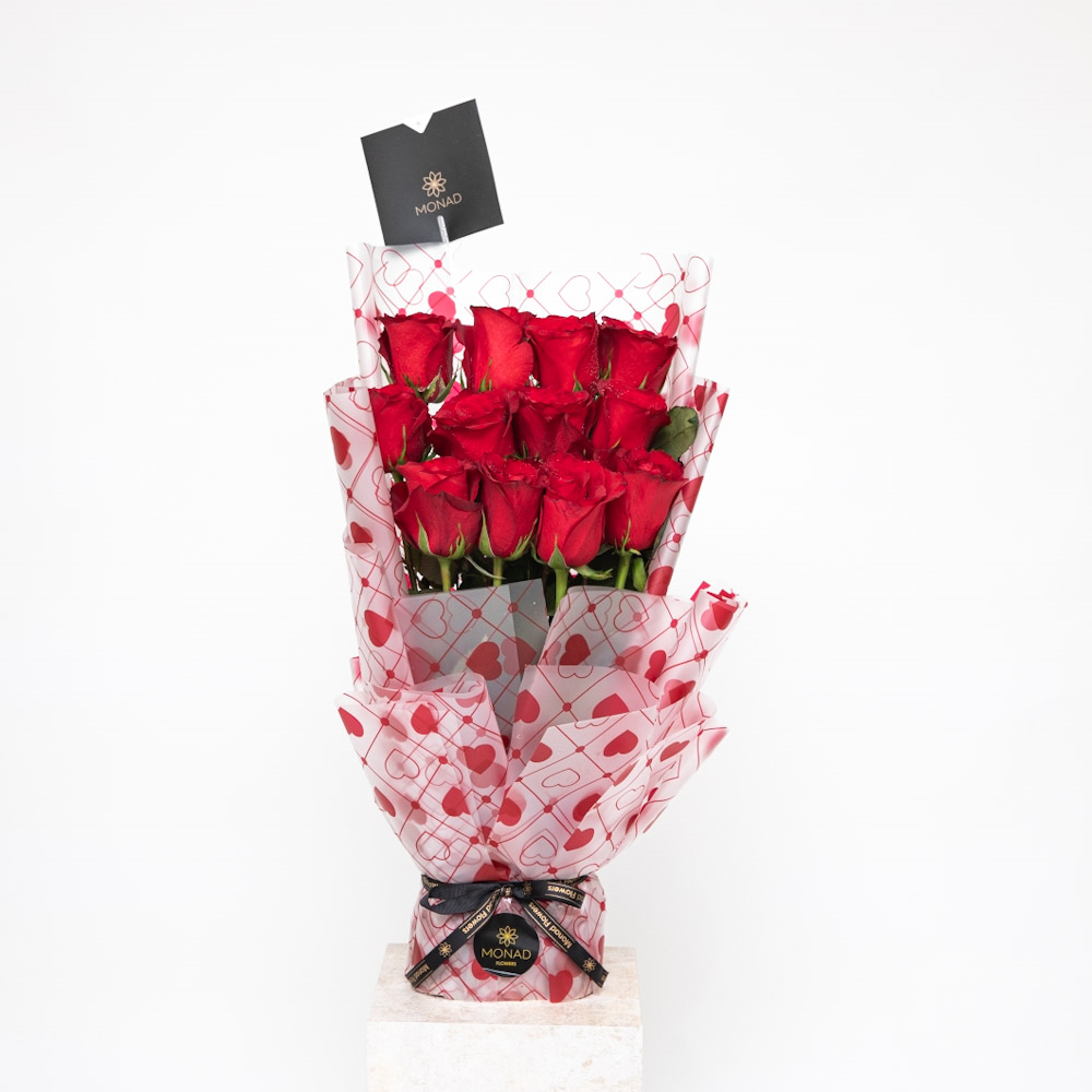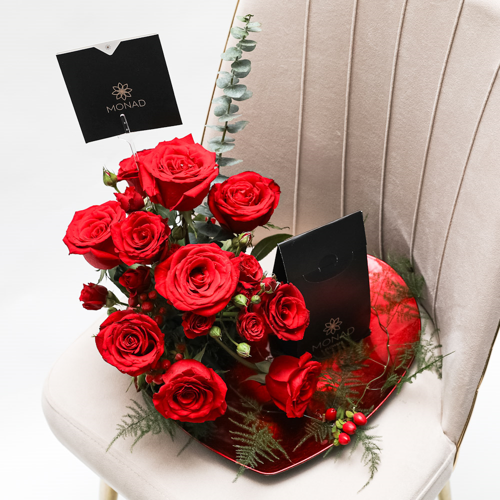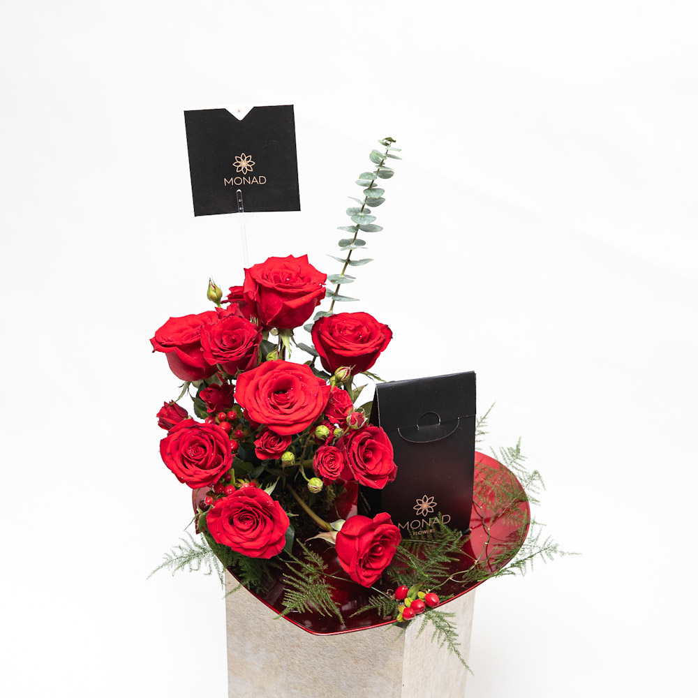 تنسيق زهري راقي من زهور الجوري الحمراء الفاخرة مع لمسات خضراء طبيعية، يرافقه صندوق من الشوكولاتة البلجيكية الفاخرة، قطعة كلاسيكية تجمع بين الرقي والإهتمام بالتفاصيل.