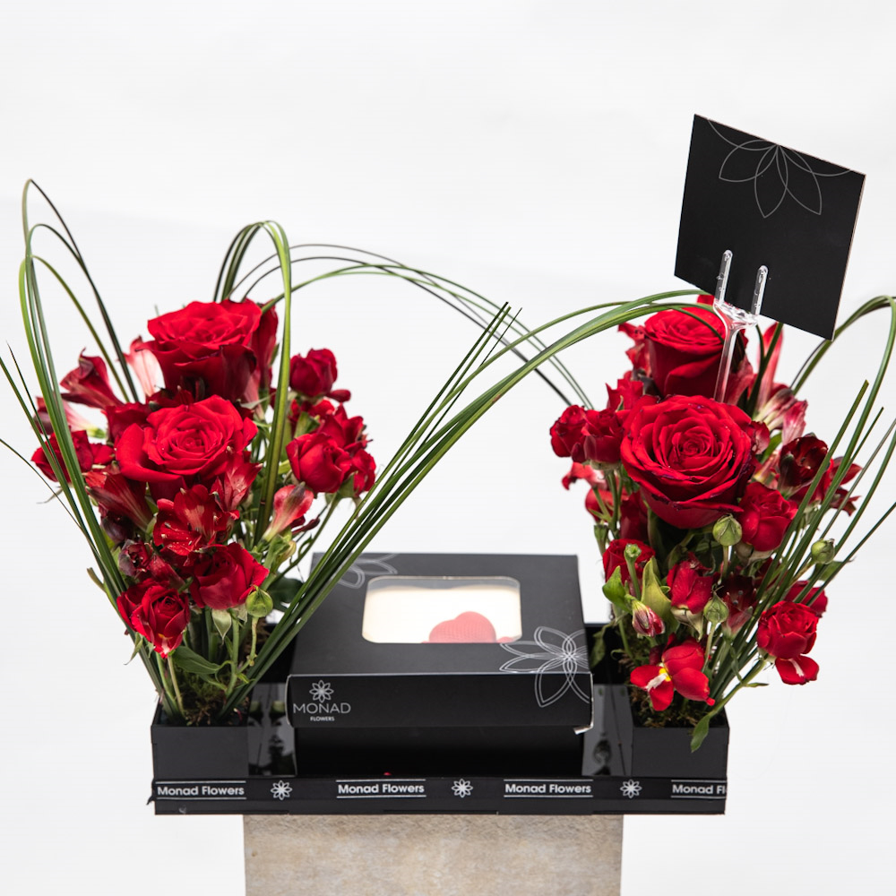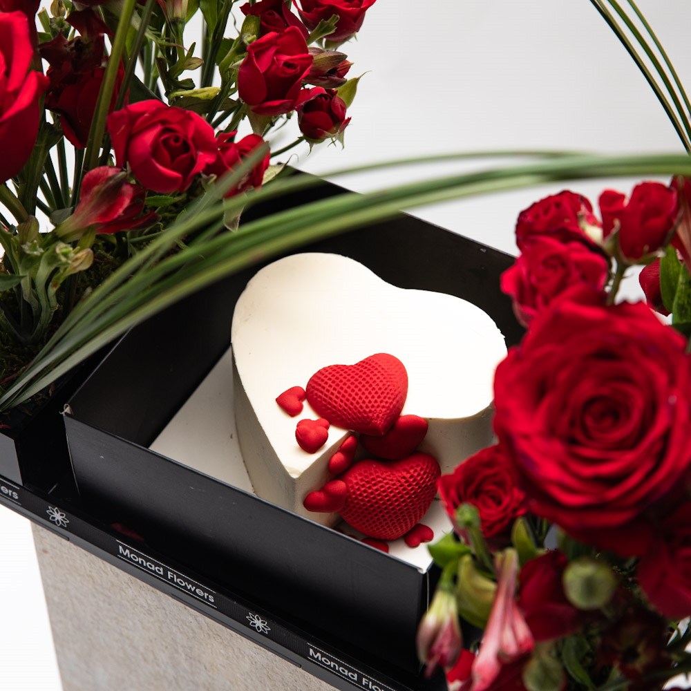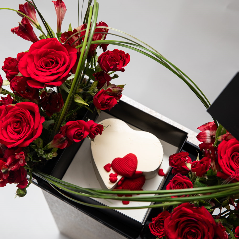 تنسيق متوازن يضم زهور جوري حمراء على الجانبين تحتضن كيكة على شكل قلب في المنتصف. تصميم متناغم يعكس الحب، التوازن، والمشاعر الخالدة.