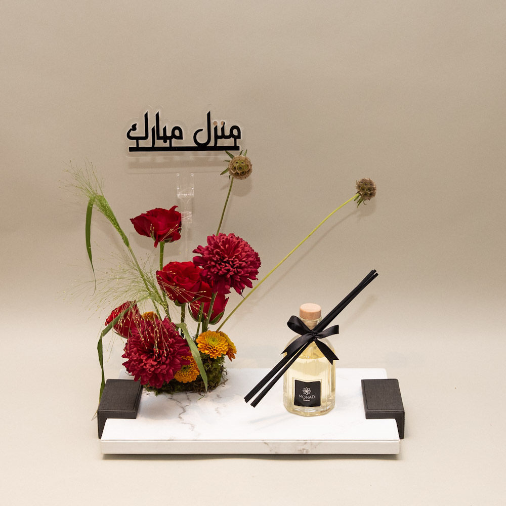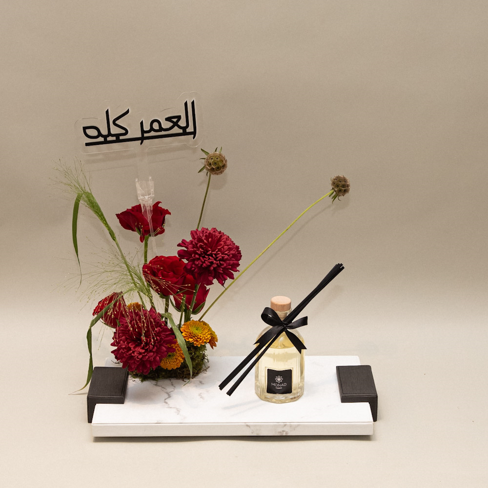 مقدم في قاعدة رخامية فاخرة وعصرية، يضم هذا التنسيق الراقي زهورًا حمراء غنية مع لمسات ذهبية أنيقة وتفاصيل خضراء طبيعية ناعمة. يأتي مرفقًا مع عطر مميز بنظام الدفيوزر ليمنح تجربة حسية راقية تجمع بين الجمال البصري والعطر الناعم الدائم، ما يجعله خيارًا مثاليًا للإهداء الفاخر أو لإضفاء لمسة أنيقة على المساحات الراقية.