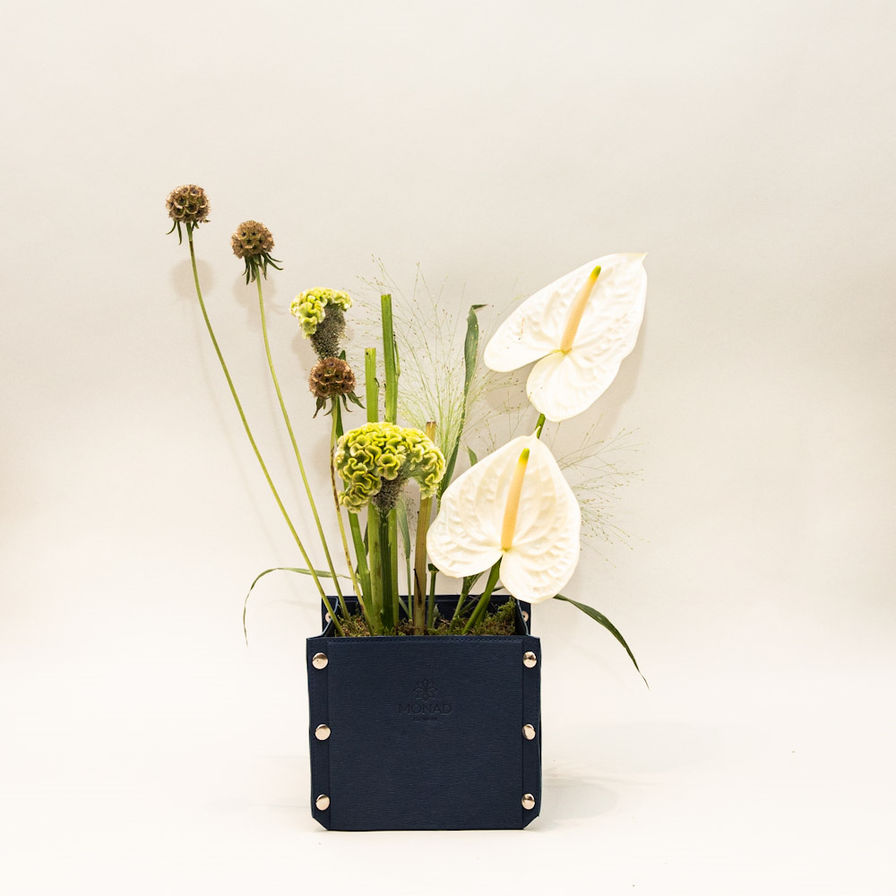باسكت أنيقة من الجلد مليئة بأزهار الأنثوريوم وأزهار الواكس.