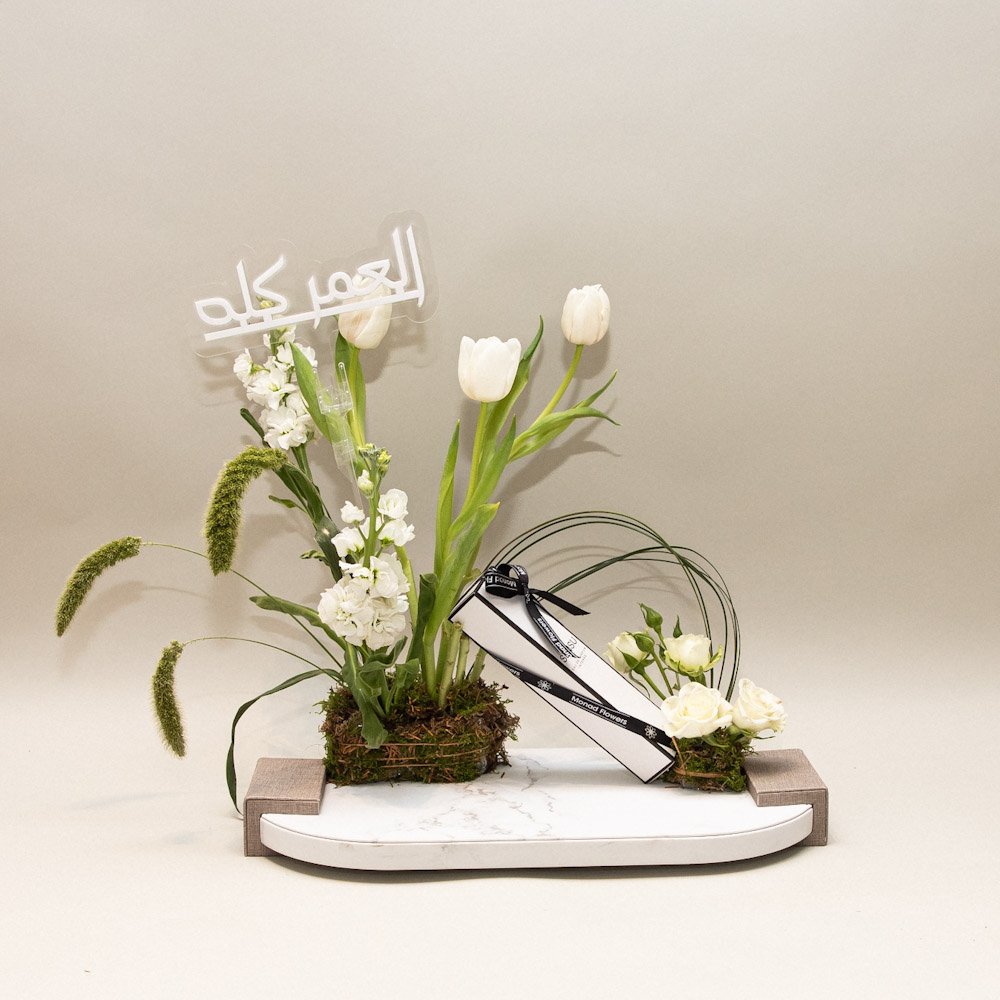 مقدم في قاعدة رخامية فاخرة وعصرية، يضم هذا التنسيق الراقي زهور التوليب البيضاء الأنيقة مع أزهار بيضاء ناعمة ولمسات خضراء طبيعية بتصميم مستوحى من الحدائق. معزّز بعطر ناعم ومميز يضيف لمسة حسية راقية، ليكون قطعة هادئة وأنيقة تناسب الإهداء الفاخر أو لإضفاء جمال ناعم على المساحات الراقية.