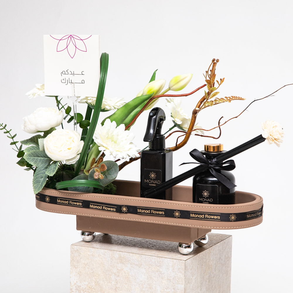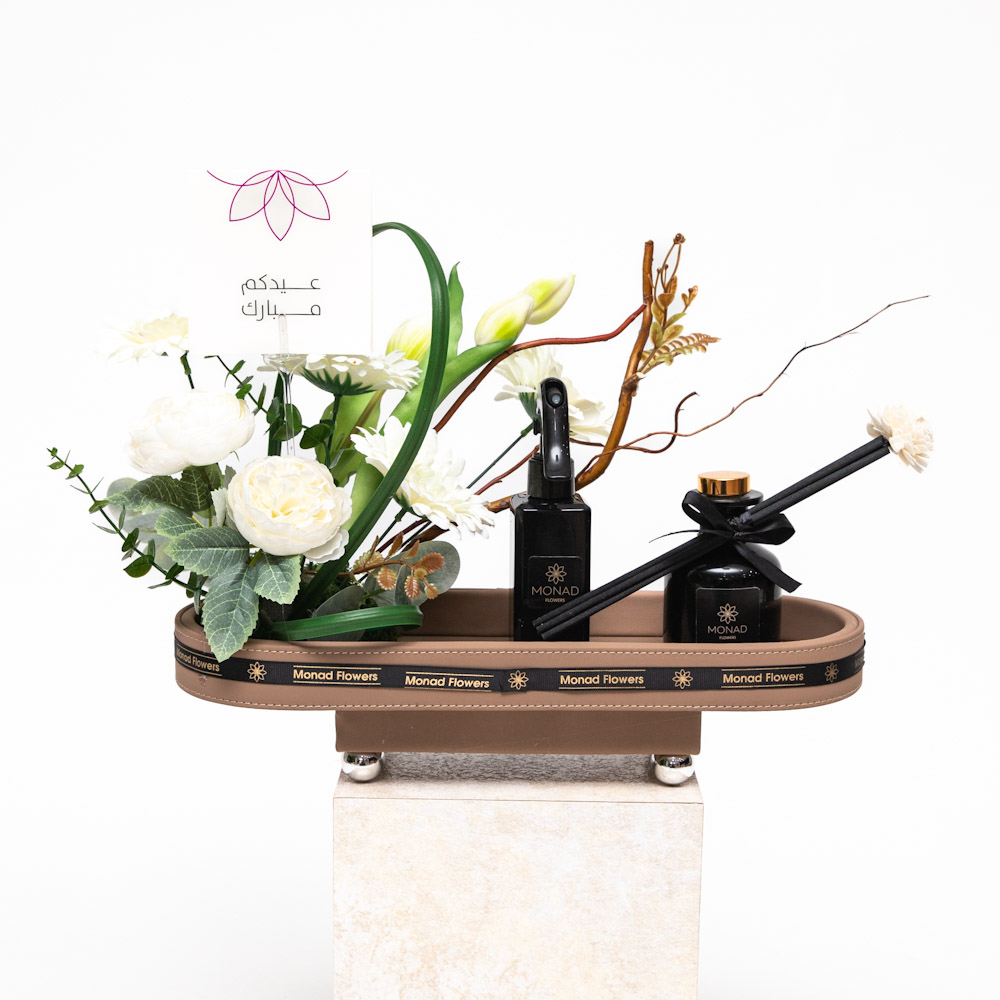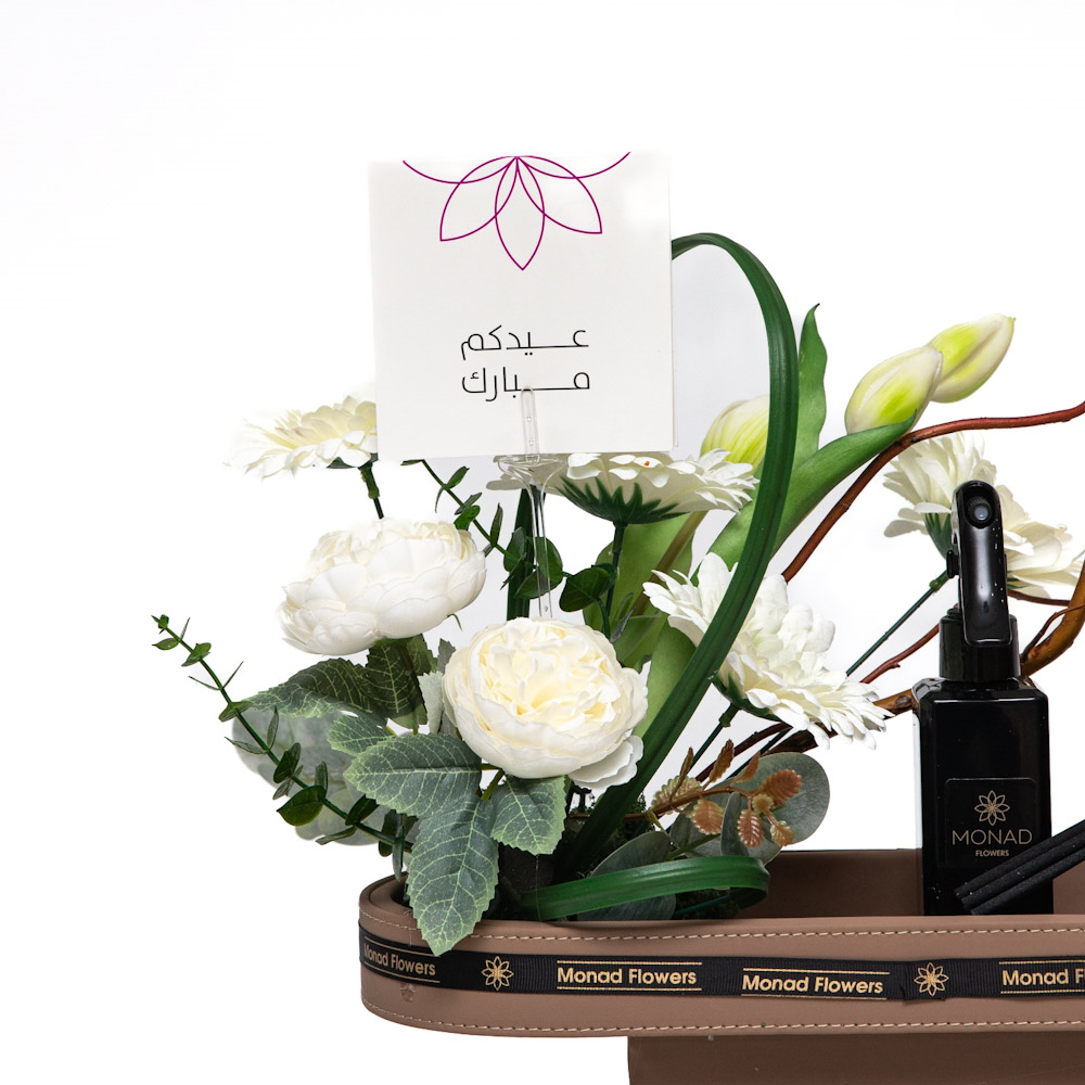 مقدمة على صينية أنيقة، يضم هذا التنسيق زهور بيضاء محفوظة بعناية مع لمسات خضراء غنية، ليعكس جمالاً ناعماً وإحساساً بالإنتعاش والهدوء. مرفقة بمجموعة عطرية فاخرة (فواحة) لتجمع بين الأناقة البصرية وتجربة حسية تدوم. مثالية للإحتفال بالعيد بنقاء وفرح ولمسة من الأناقة الهادئة.