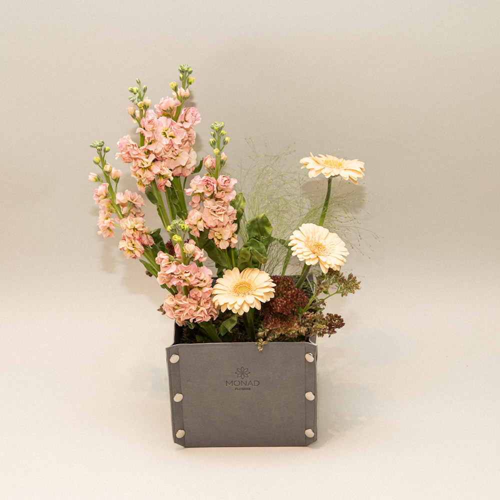 إضاءة هادئة تتجلى من خلال ملمس ناعم وخطوط متوازنة. هذه القطعة، التي تحتوي على زهور الجيربيرا والماثيولا، تهدئ الحواس وتضفي على الغرفة إشراقة أنيقة.