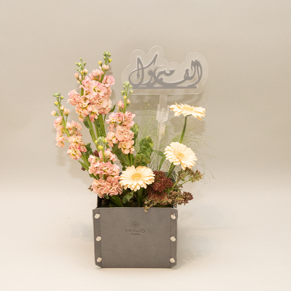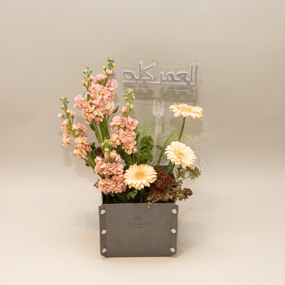مقدم في قاعدة جلدية فاخرة وعصرية، يضم هذا التنسيق الأنيق زهور الستوك بلون الخوخ الناعم مع جربيرا كريمية ولمسات موسمية رقيقة. قطعة مبهجة وراقية تناسب المناسبات السعيدة، والاحتفالات الخاصة، أو الإهداء الأنيق.
