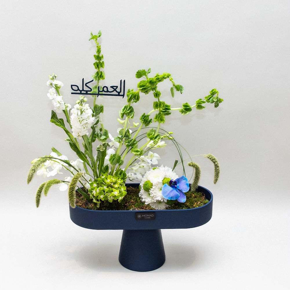 مقدم في قاعدة جلدية فاخرة وعصرية، يضم هذا التنسيق الفني زهورًا بيضاء نقية مع أزهار خضراء منعشة ولمسات طبيعية انسيابية. قطعة عصرية راقية تناسب المساحات الأنيقة، والمناسبات الحديثة، أو الإهداءات المميزة.