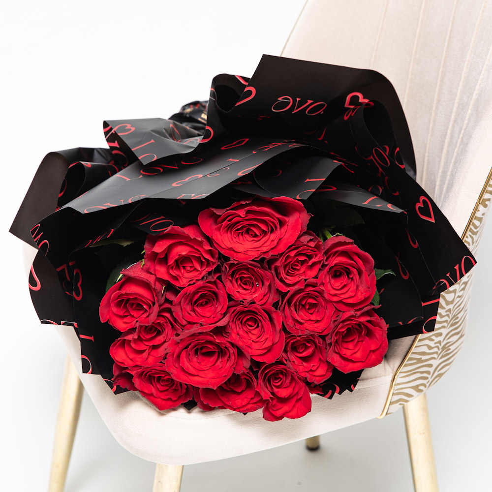 باقة جريئة ورومانسية من زهور الجوري الحمراء الغنية، مغلفة بورق أسود عصري مزين بلمسات قلوب ناعمة. تنسيق مصمم ليترك أثراً لا ينسى ويعبر عن مشاعر عميقة.