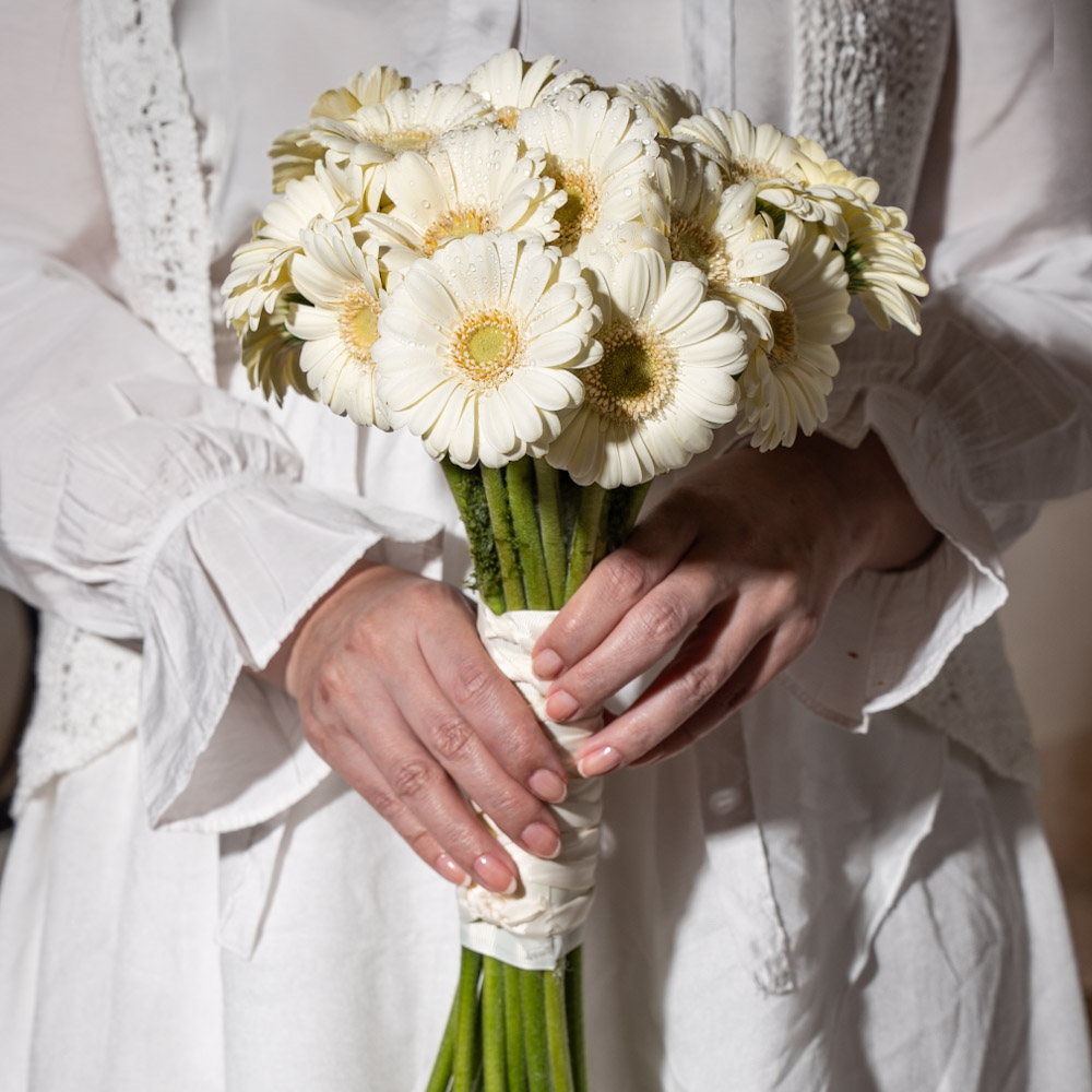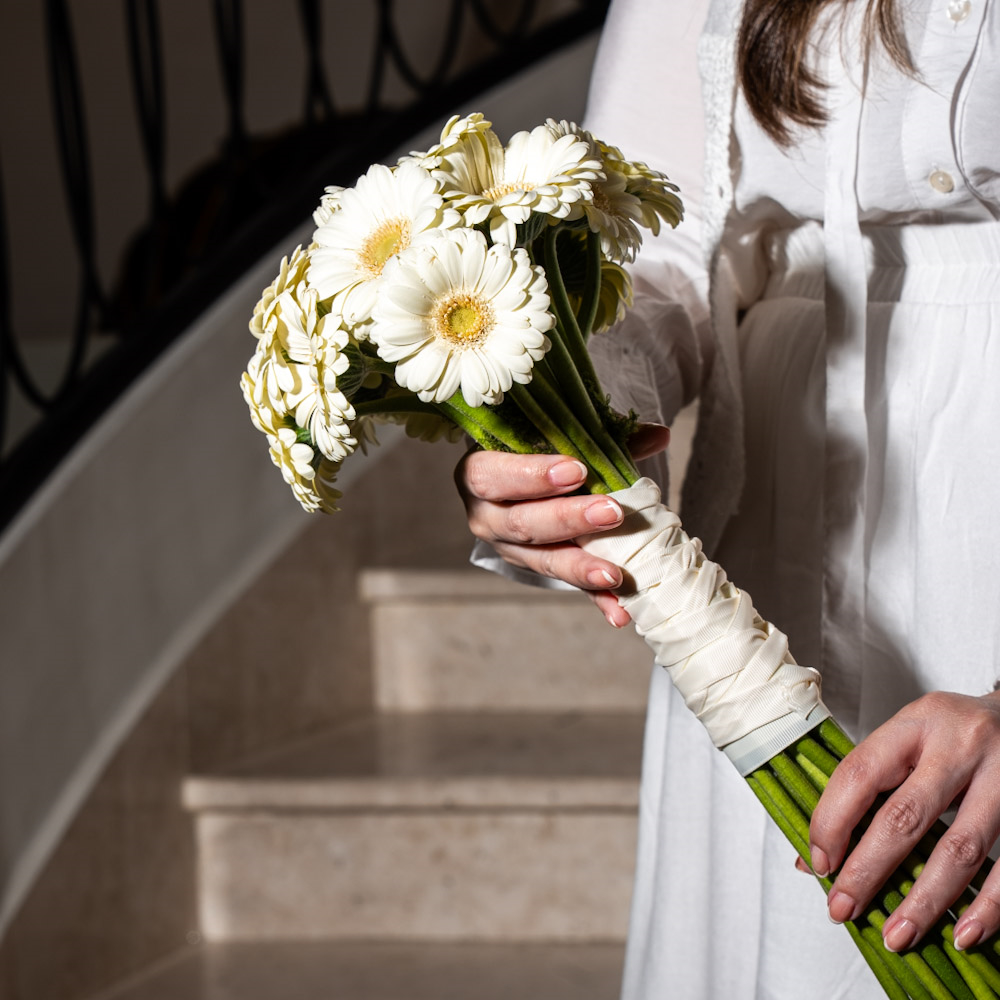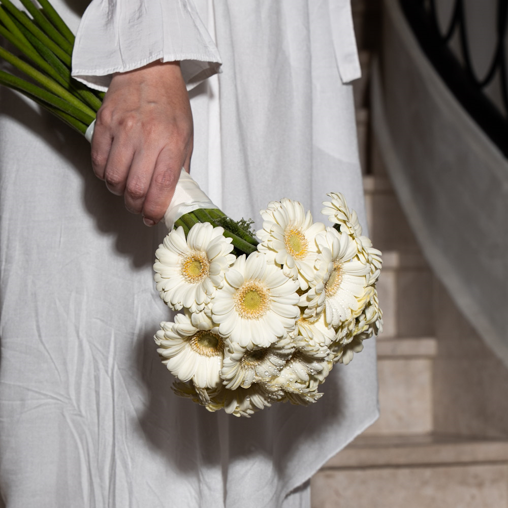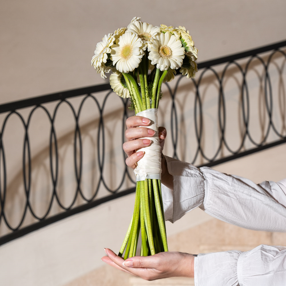باقة العروس العصرية تتميز بأزهار الجيربيرا البيضاء بتصميم انسيابي. تصميم ناعم وبسيط يعكس أناقة حديثة.