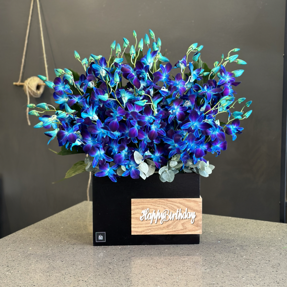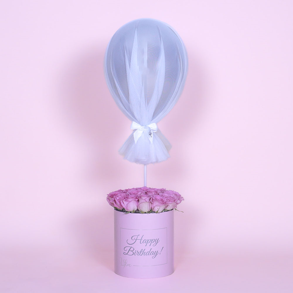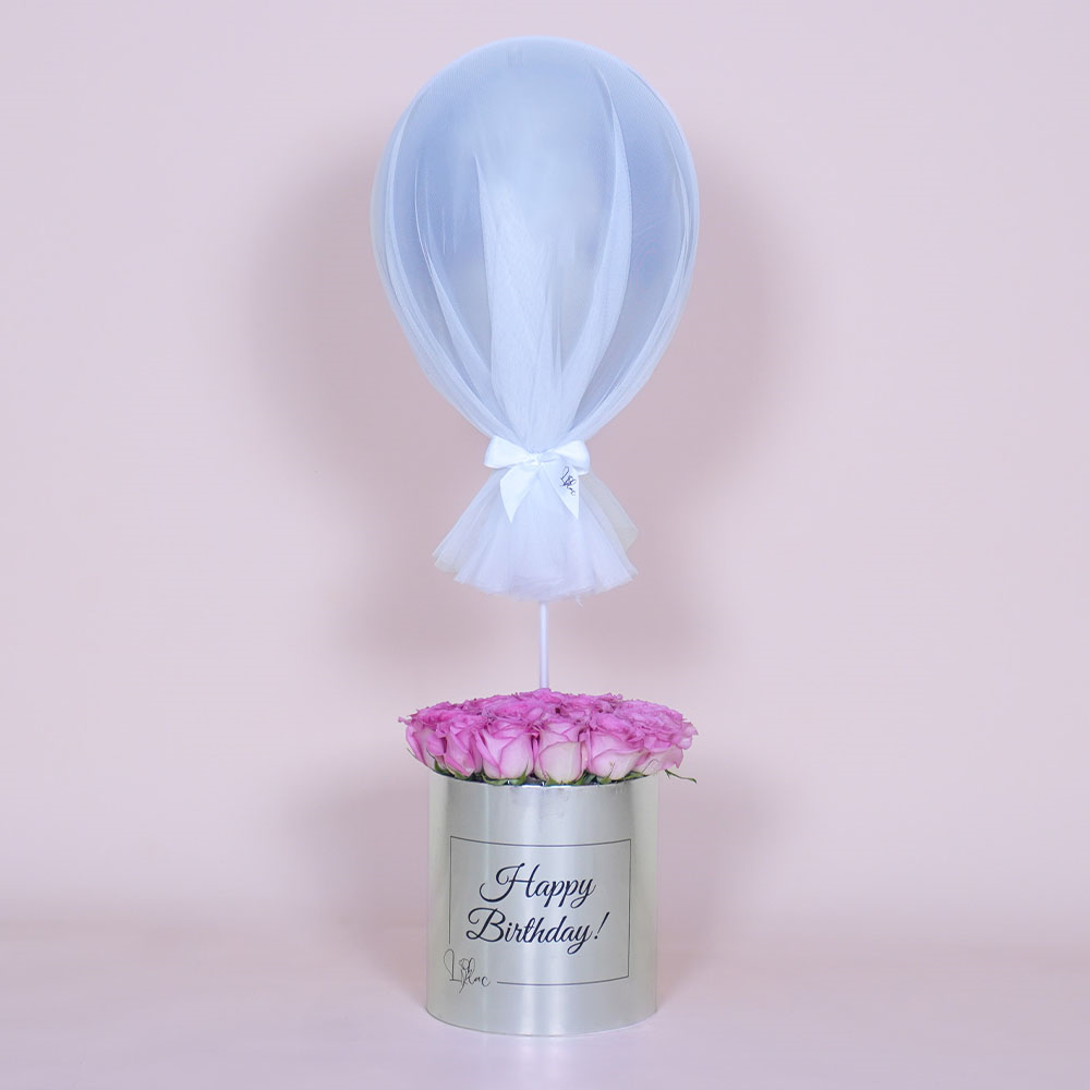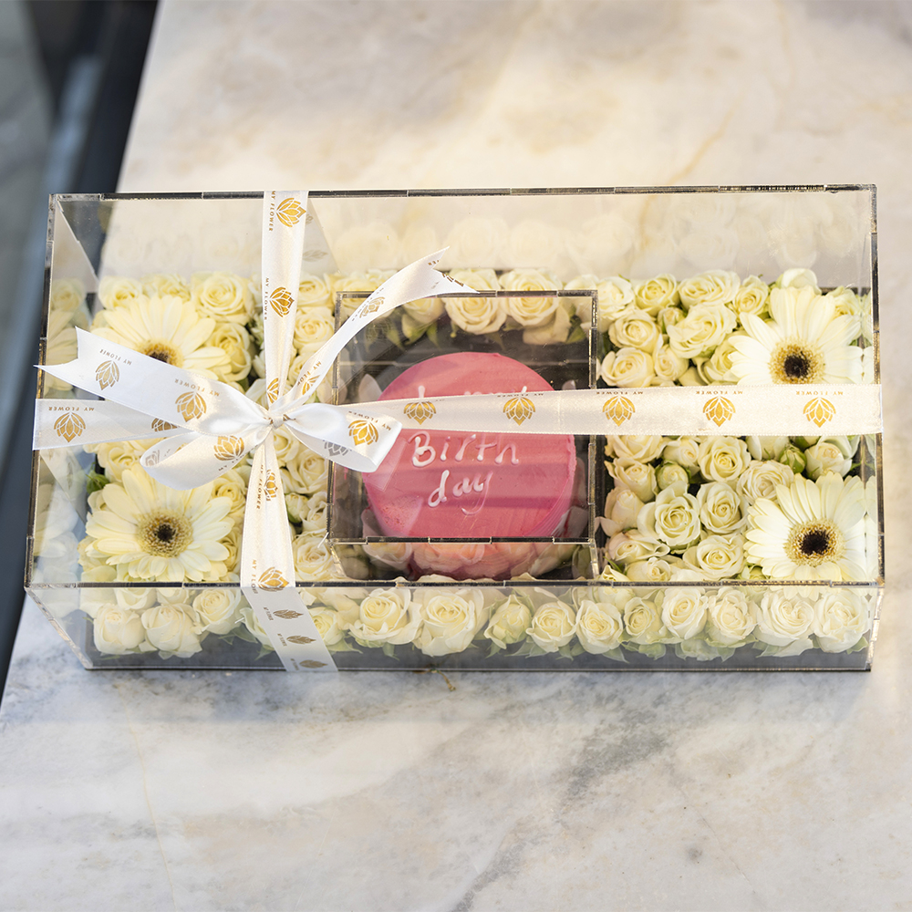 بوكس اكريلك مع زهور الجربيرا، البيبي جوري وكيكة.