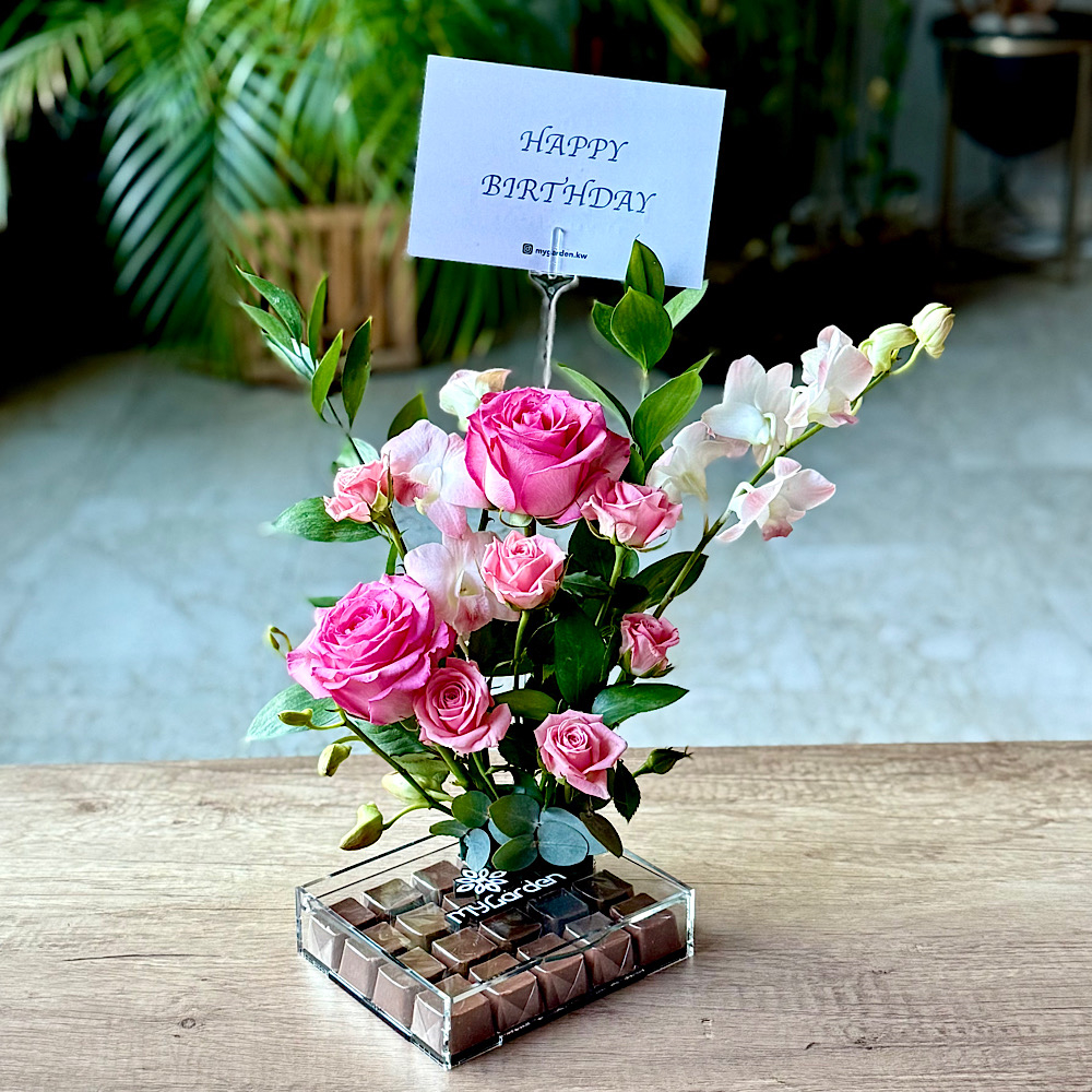 البوكيه يحتوي على الجوري والبيبي جوري مع بوكس الشوكولاتة.