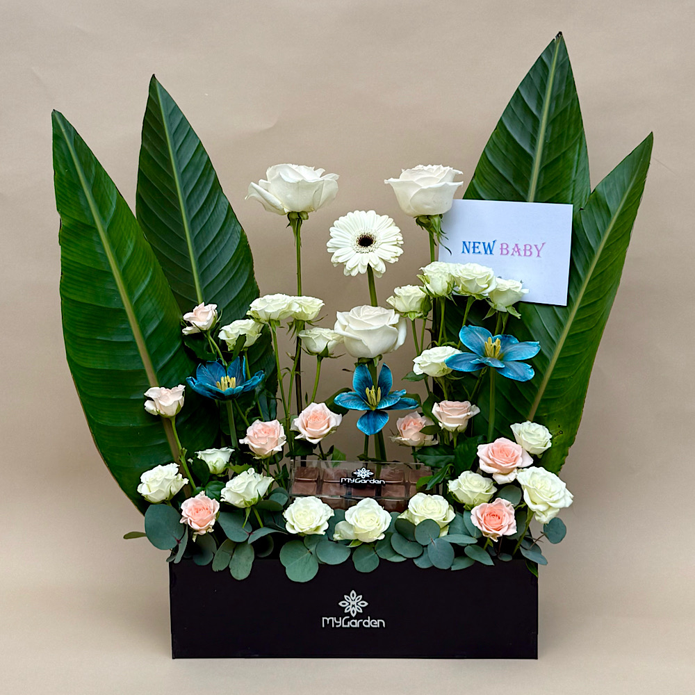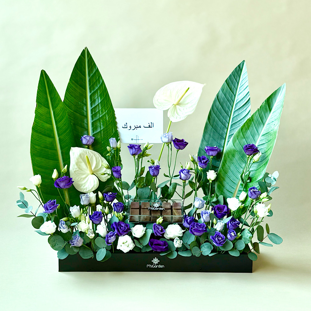 باقة زهور تحتوي على زهور الليزيانثوس، الأنثوريوم وأوراق إستوائية، مع شوكولاتة بلجيكية فاخرة ومرتبة بشكل جميل في صندوق مستطيل.