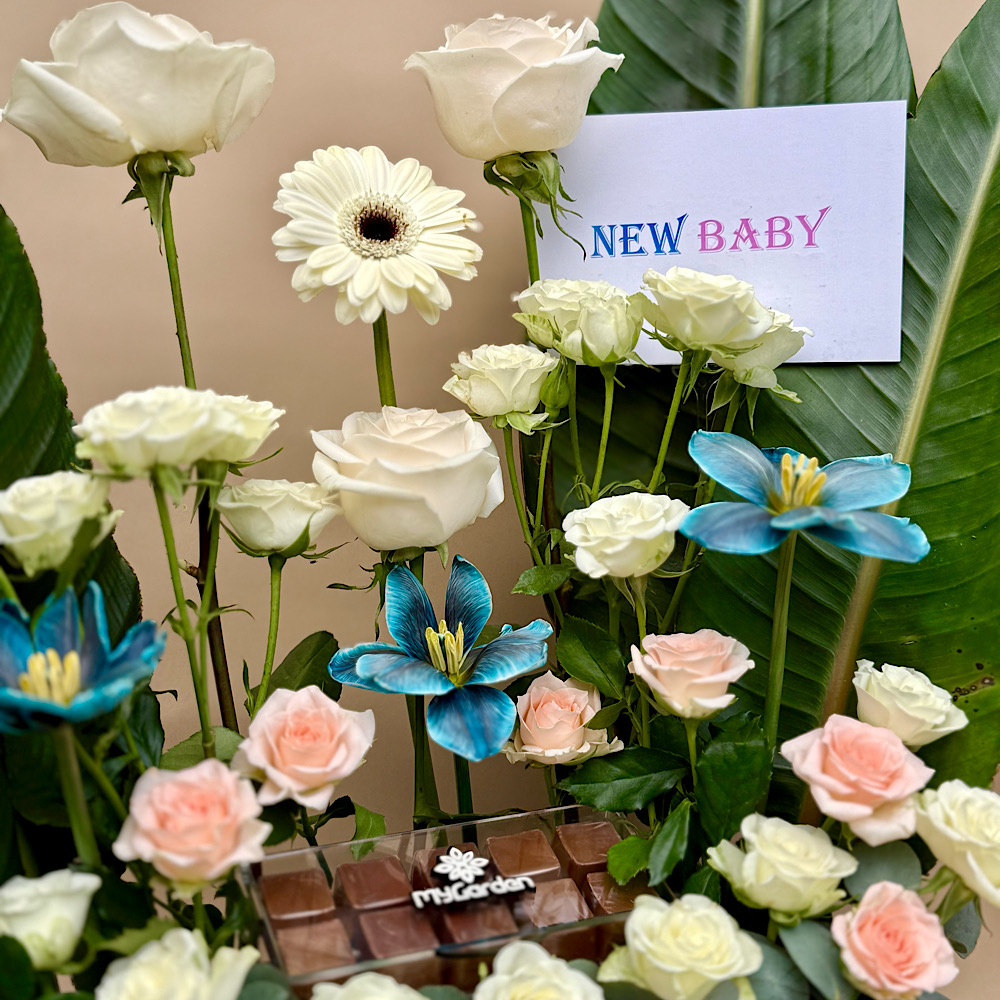 باقة مولود فاخرة بأزهار روز باللون الأبيض وباللون الوردي الفاتح، توليب بالأزرق، الليليز بالأزرق، جربيرا باللون الأبيض مع شوكولاتة بلجيكية فاخرة من ماي قاردن.