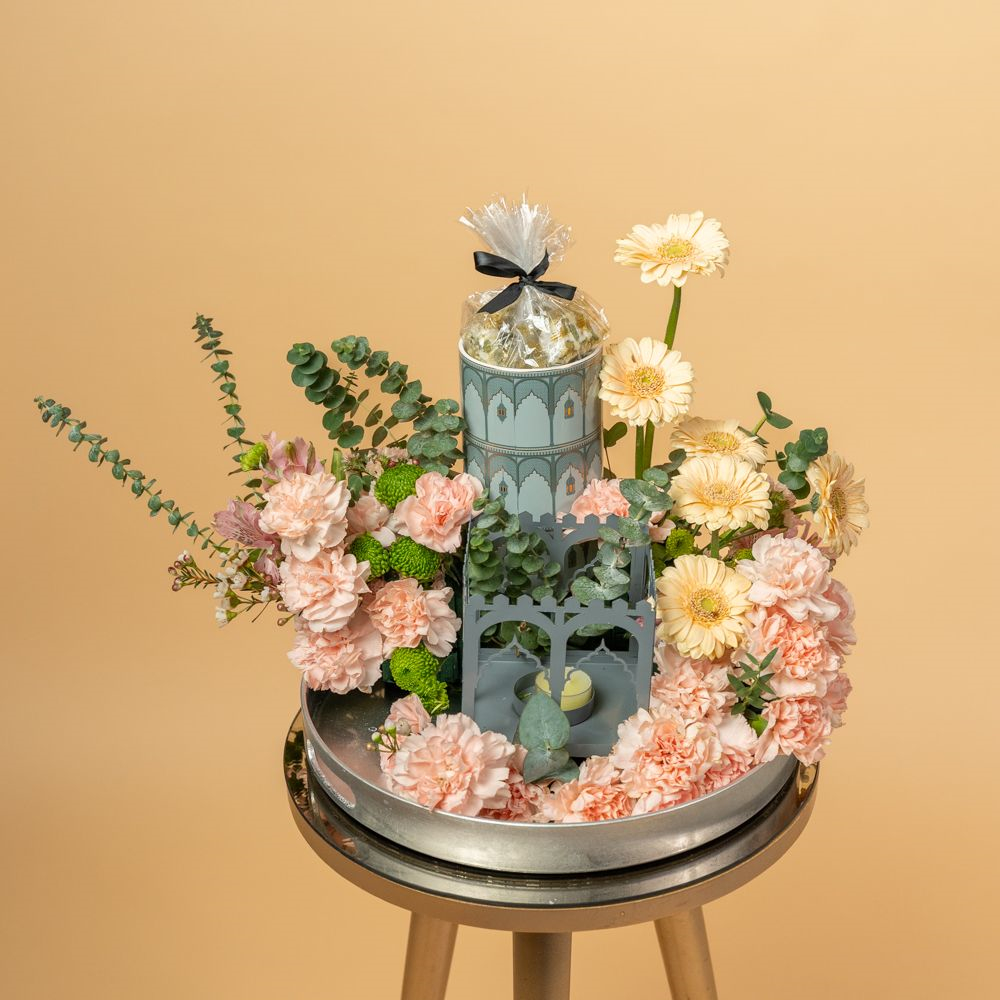 تنسيقات الزهور لحديثي الولادة للفتيات الصغيرات، استمتع بالجمال الرقيق لإبداعاتنا، حيث يتم تعليق مجموعة ملابس الأطفال الثمينة على حامل مصنوع من أغصان الأشجار، مزينة بأزهار وردية مثل جربر والكوبية وبيبي بينك ولمسة من اللون الأخضر.