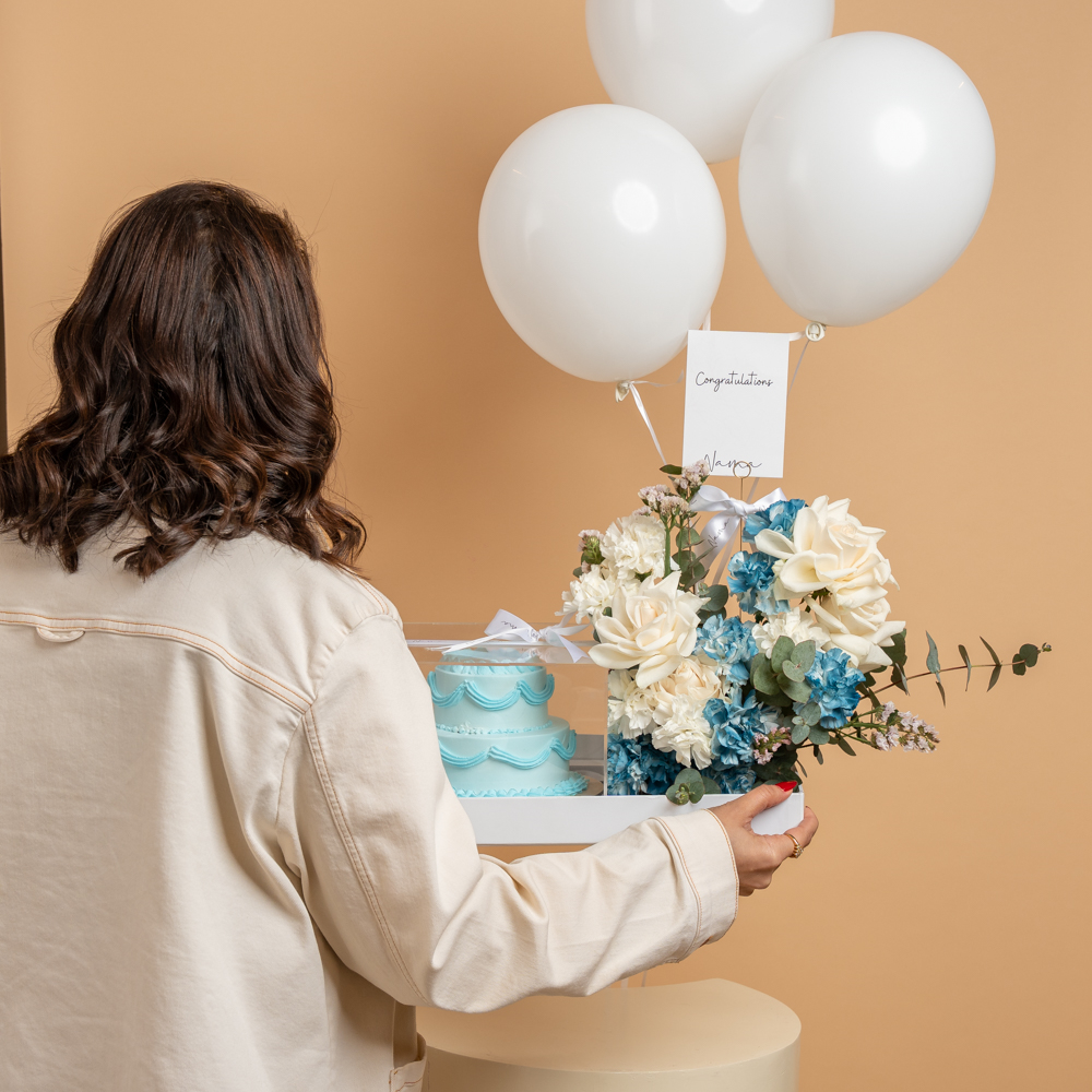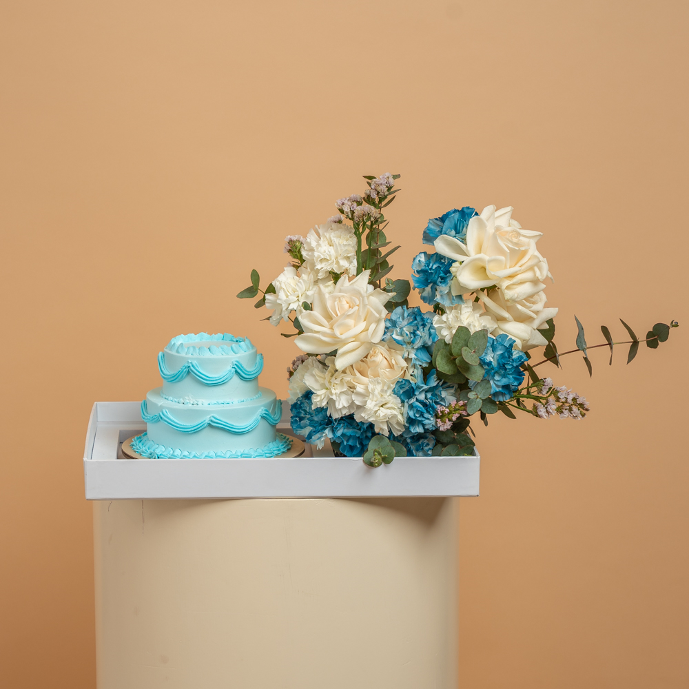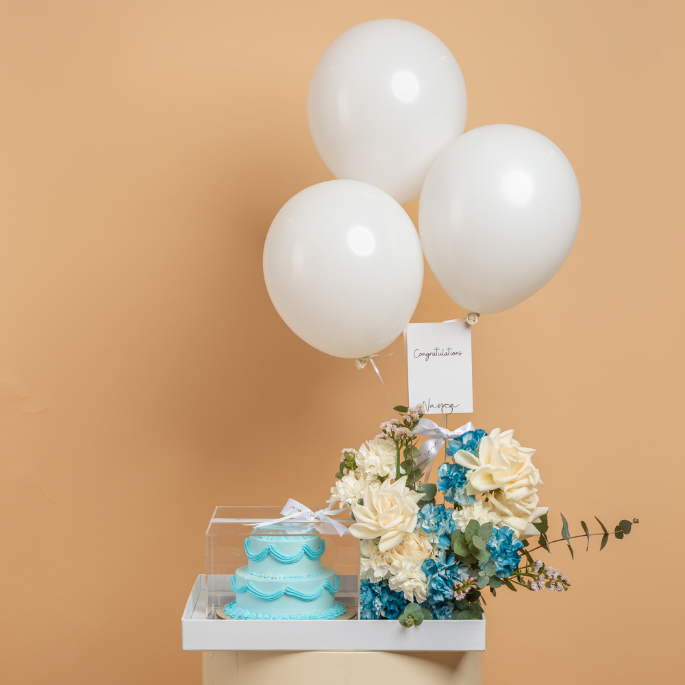 صينية أنيقة تتميز بأزهار الجوري والكارنيشن مع كيكة بطبقتين باللون الأزرق و 3 بالونات هيليوم.