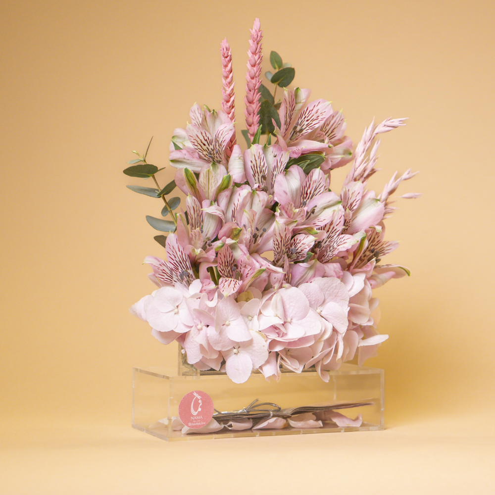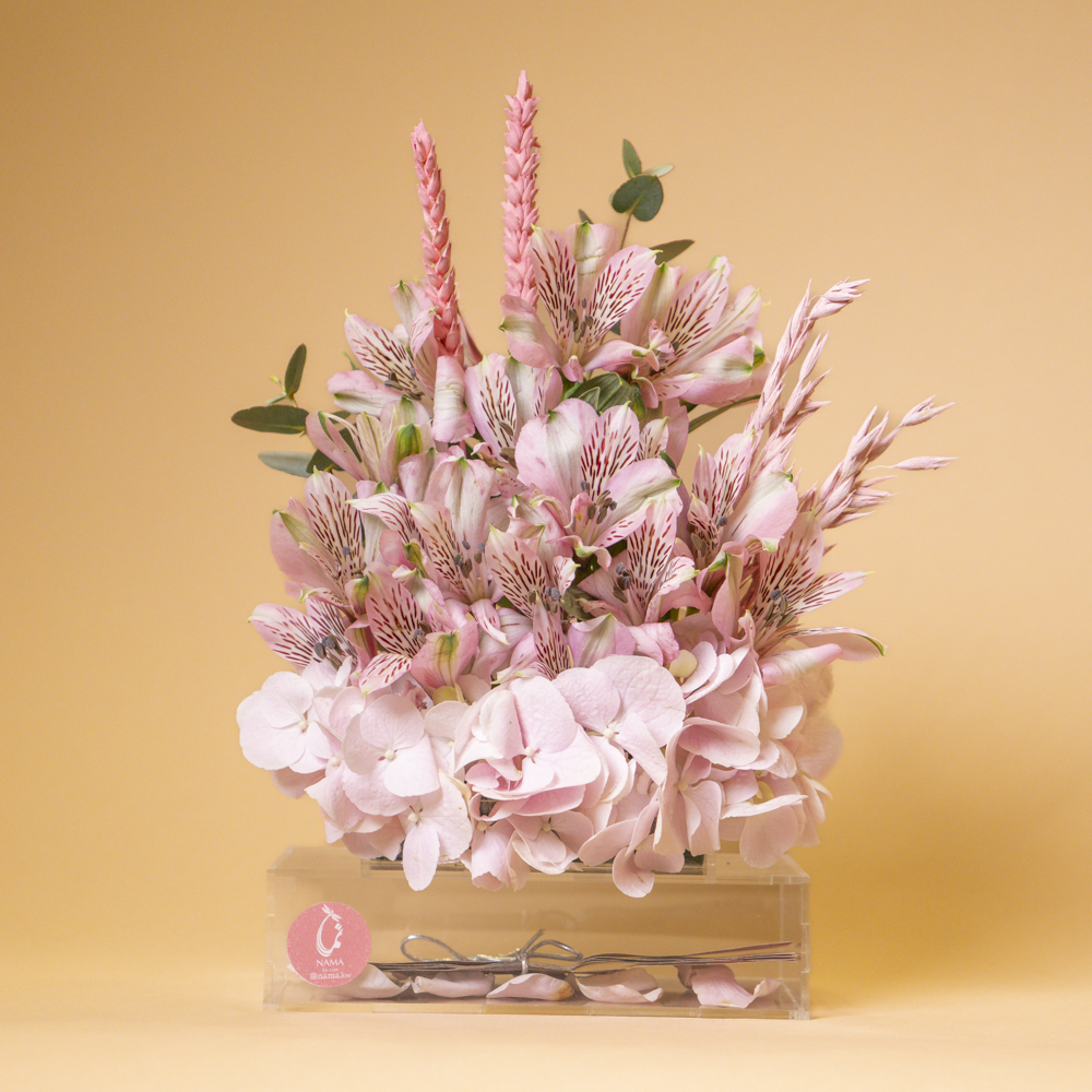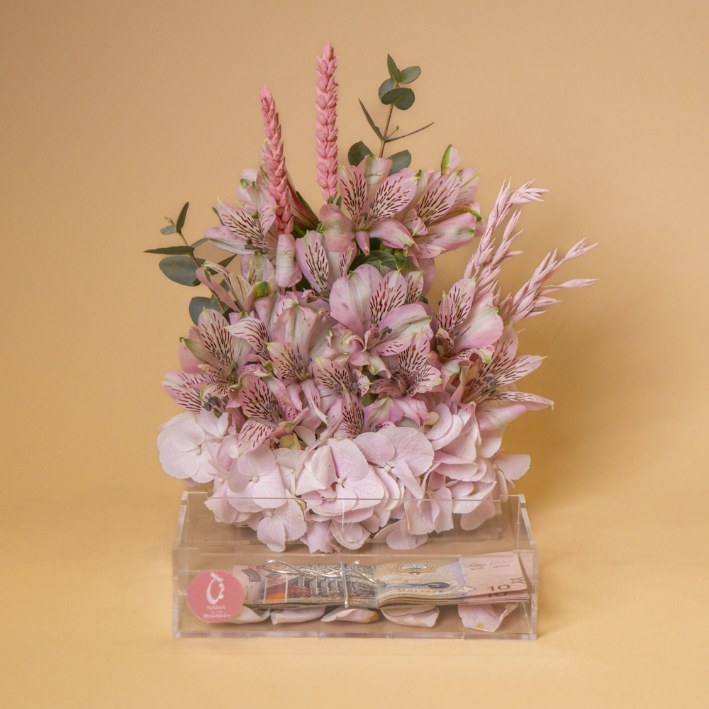 باقة ساحرة تتميز بأزهار السترومريا زالكوبية الناعمة بدرجات اللون الوردي مع بوكس فارغة للنقود. ملاحظة: الباقة لا تشمل النقود.