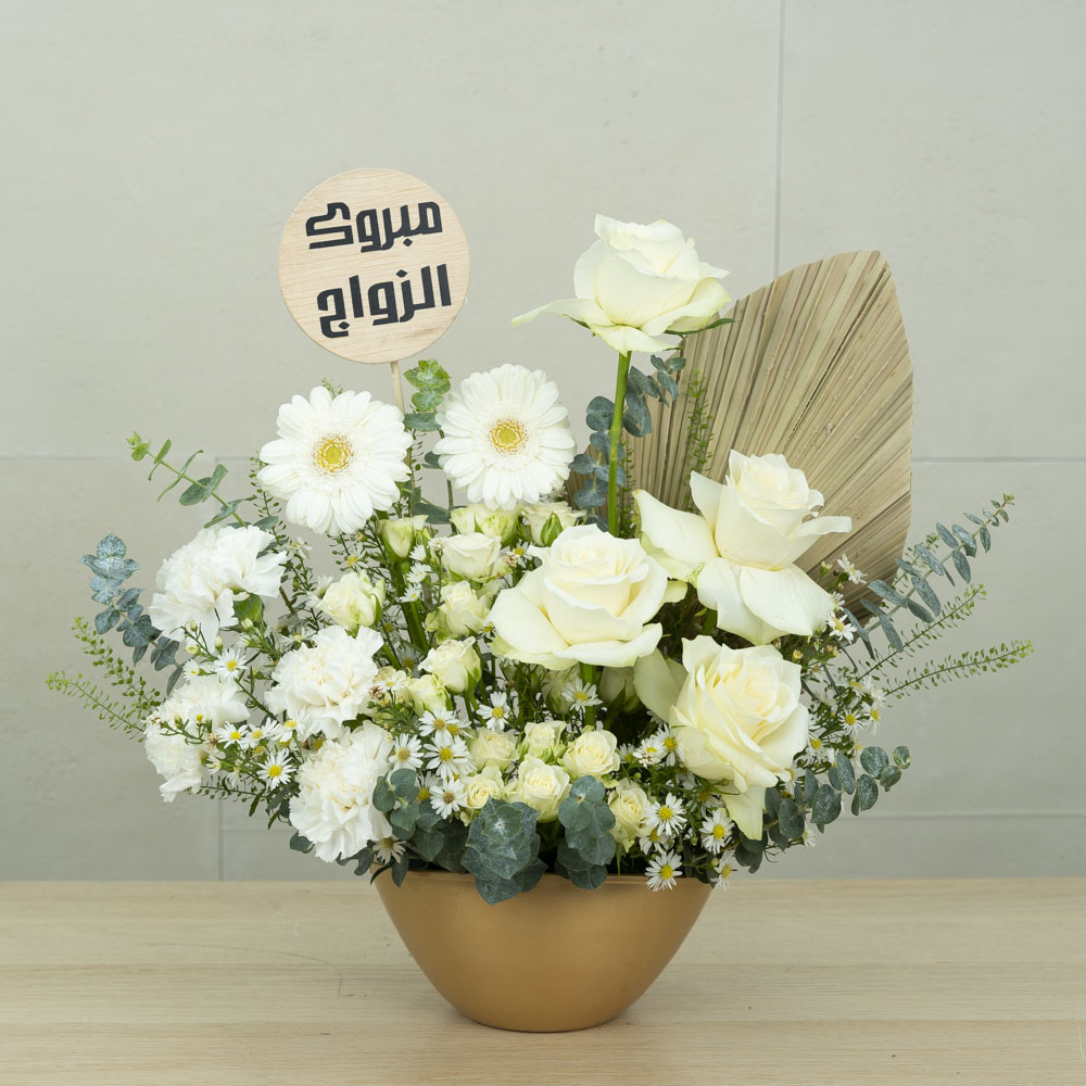 باقة تحتوي على زهور الجوري، البيبي جوري، الجيربيرا والكارنيشن، مرتبة بشكل جميل في فازة.