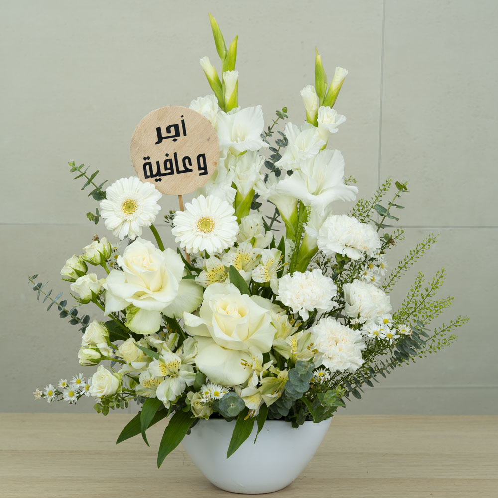 باقة تحتوي على زهور السوليداغو، الجوري، البيبي جوري، الجيربيرا والكارنيشن، مرتبة بشكل جميل في فازة.
