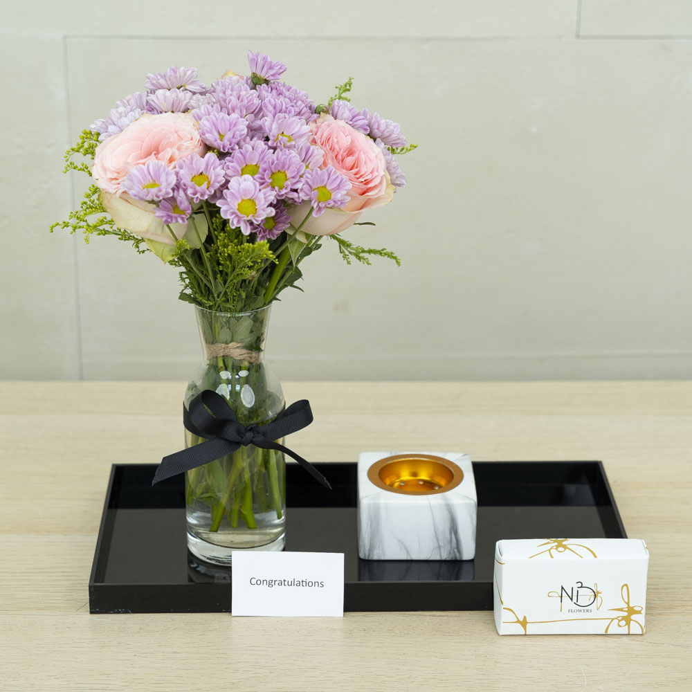 صينية تحتوي على الجوري والاقحوان مع المبخر والشوكولاتة.
