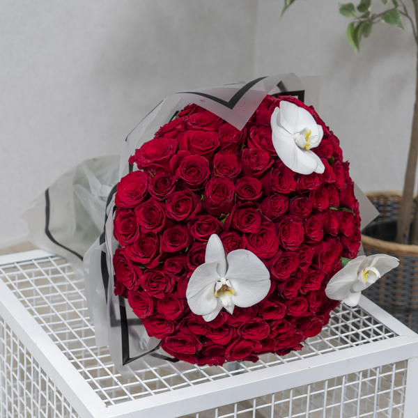 هذه الباقة تحتوي على 150 من زهور الجوري وزهور الأوركيد.