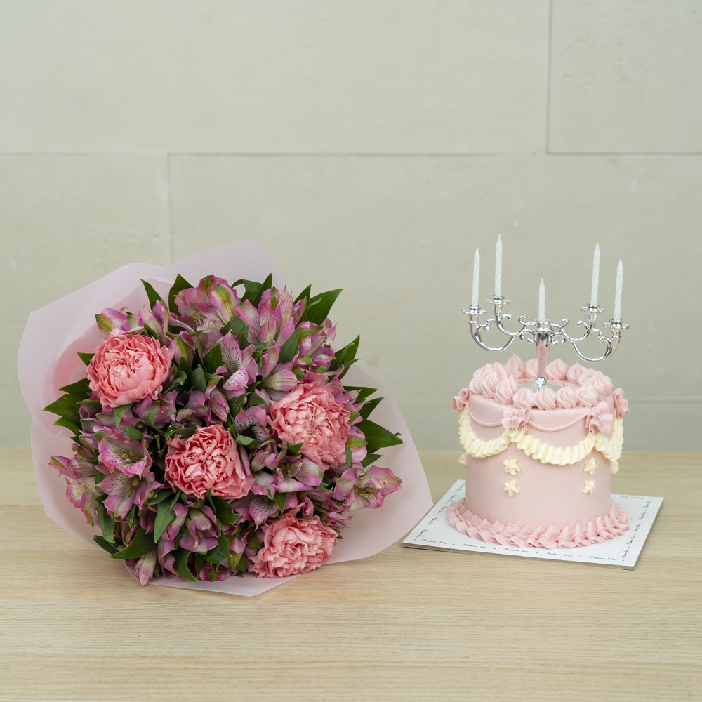 هذه الباقة تحتوي على الكارنيشن والألستروميريا مع كيكة الشوكولاتة.