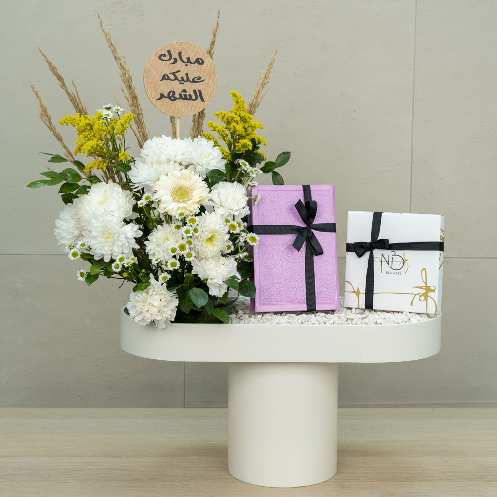 ستاند خشبي مزين بالجيربيرا، الكارنيشن والكريز مع القرآن و علبة الشوكولاتة.
