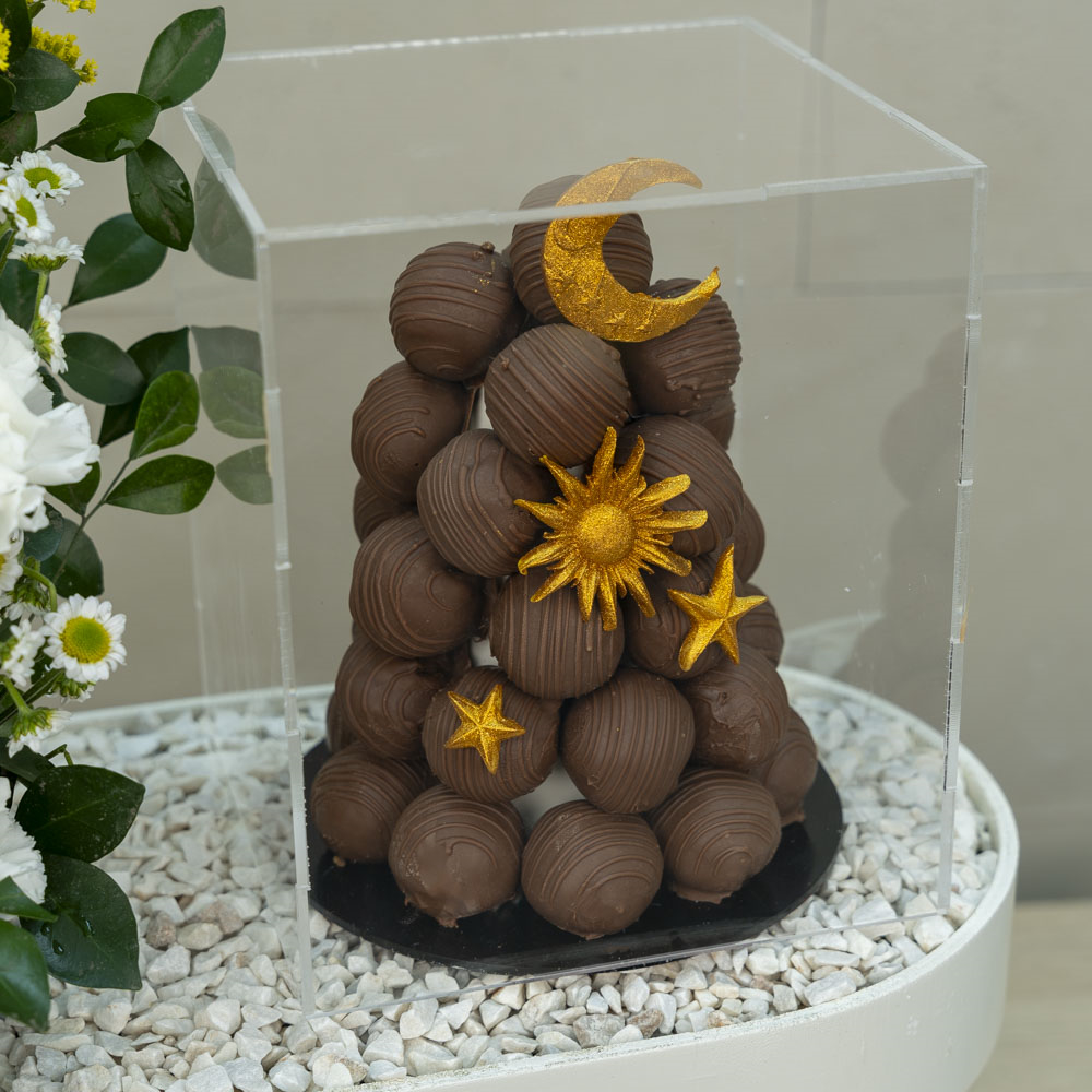 ستاند خشبي مزين بالجيربيرا، الكارنيشن والكريز بالاضافة الى برج من ترافل الشوكولاتة بحشوة التمر الفاخر.