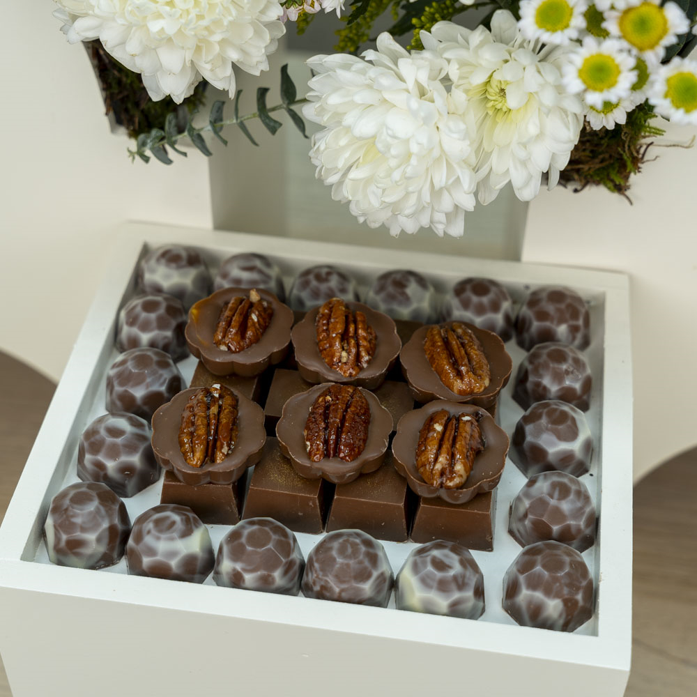 ستاند خشبي يحتوي على الكريز، الاقحوان واوراق اليوكالبتوس مع الشوكولاتة البلجيكية متعددة الحشوات.