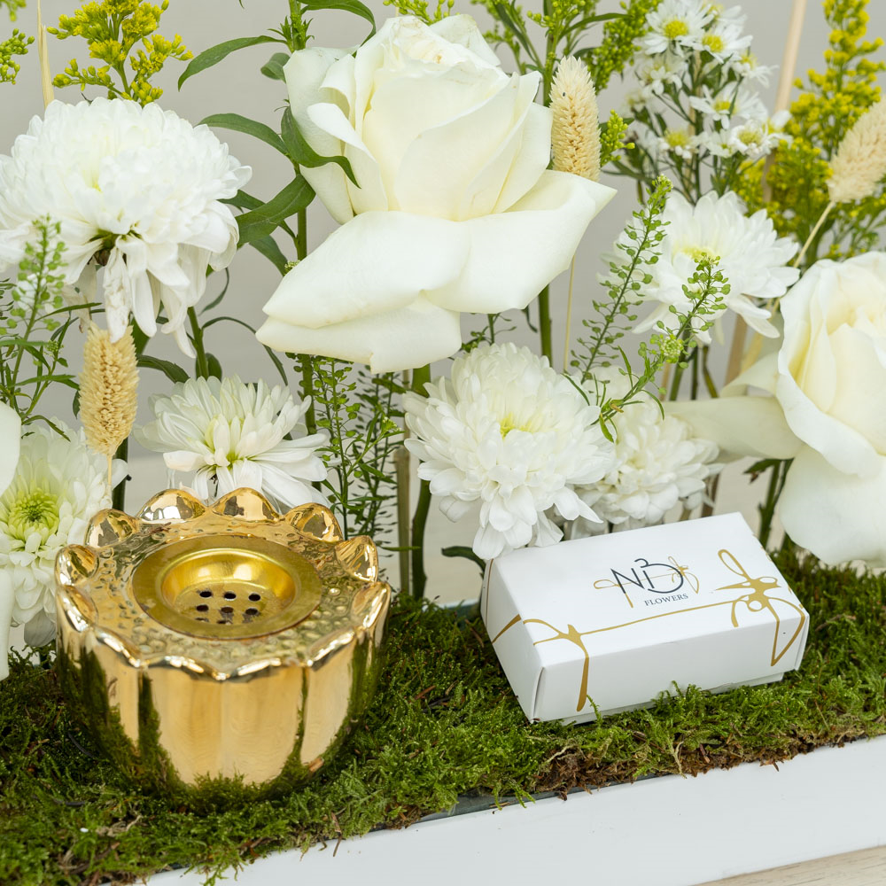 باقة تحتوي على الجوري والكريز مع مبخر وشوكولاتة.