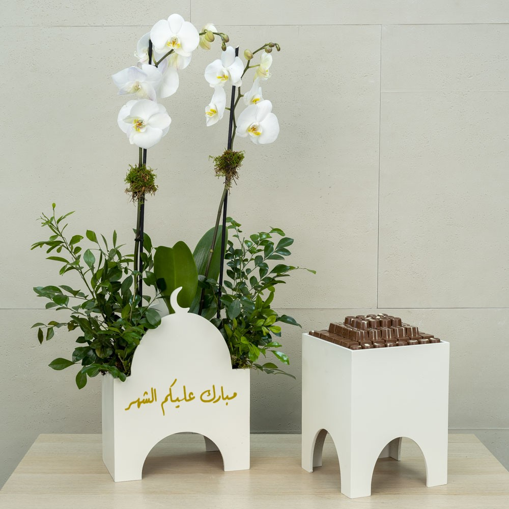 ستاند يحتوي على نبتة الأوركيد مع الشوكولاتة.