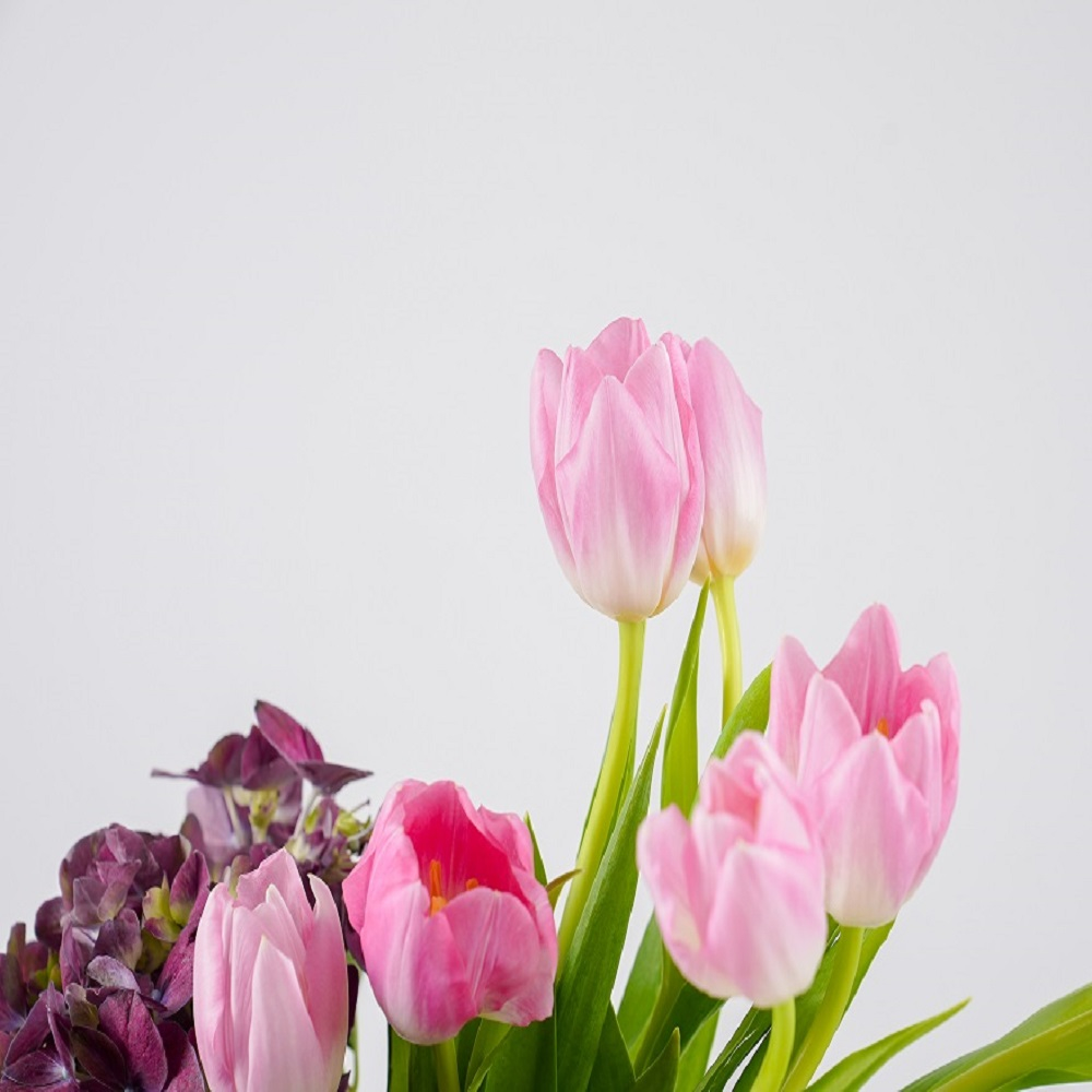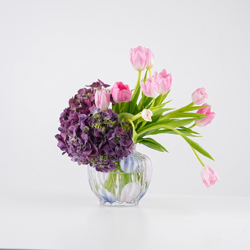 مزهرية راقية بألوان هادئة تحتوي على تنسيق من زهور الهايدرنجا والتوليب.