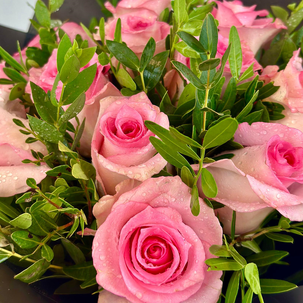 باقة يد تحتوي على الجوري والأوراق الخضراء.