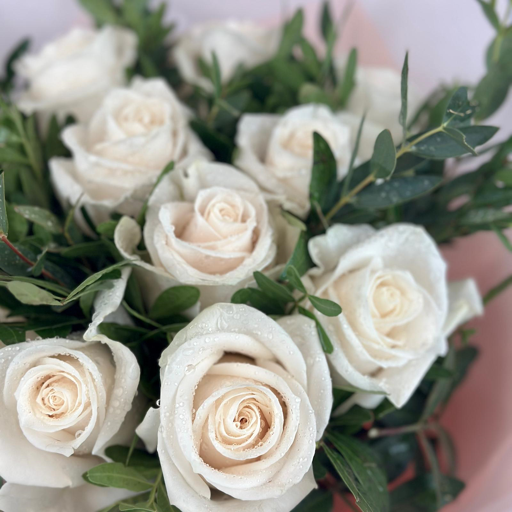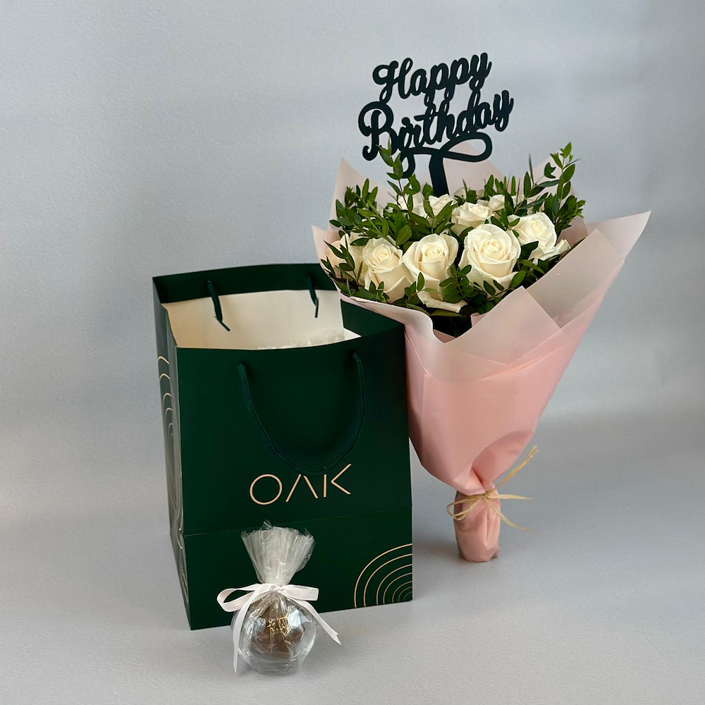 هذه باقة اليد تحتوي على الجوري والأوراق الخضراء مع الشوكولاتة.