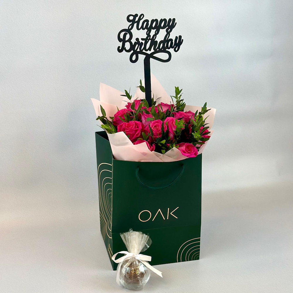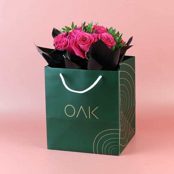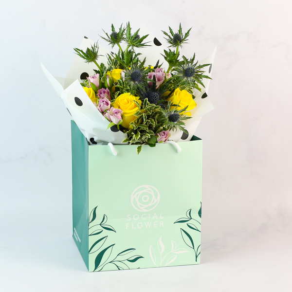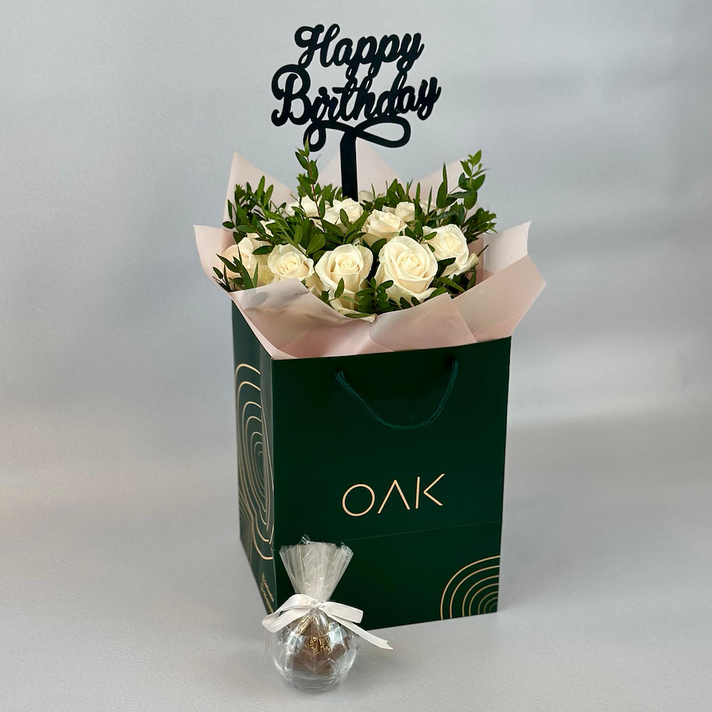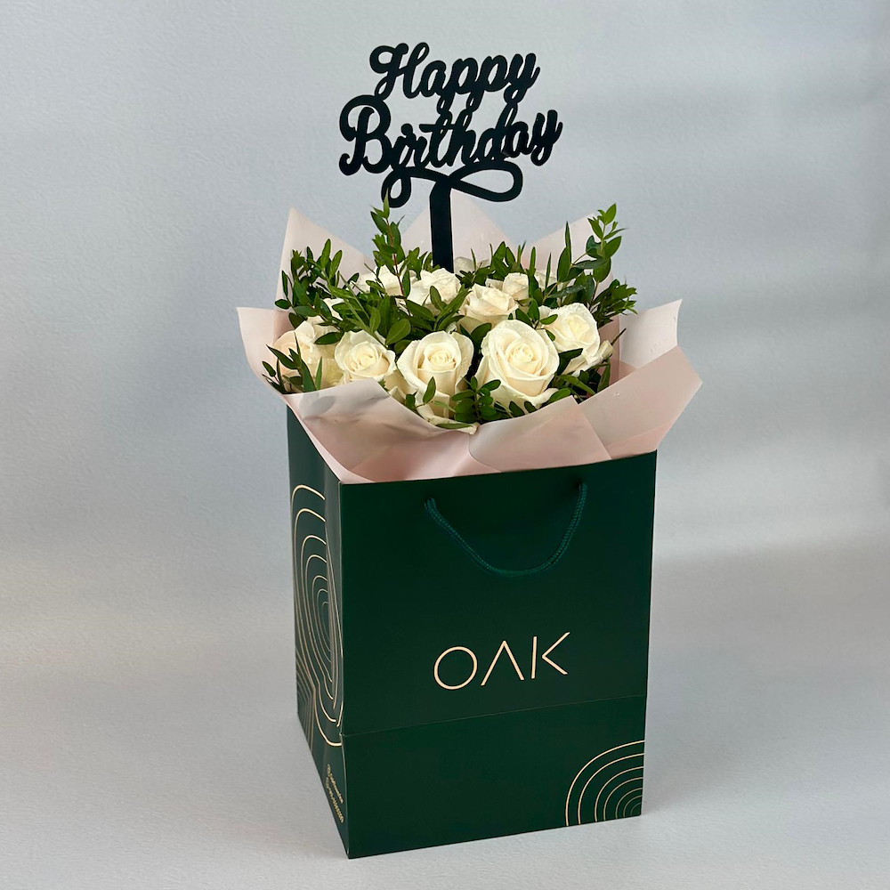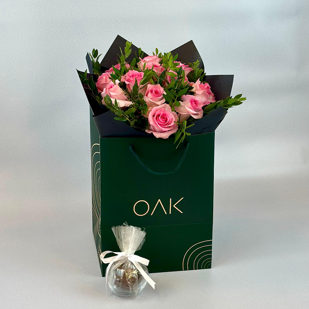 باقة تحتوي على الجوري مع الأوراق الخضراء.