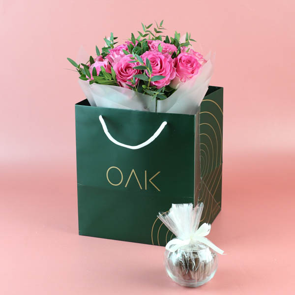 هذه باقة اليد تحتوي على الجوري والأوراق الخضراء مع الشوكولاتة.